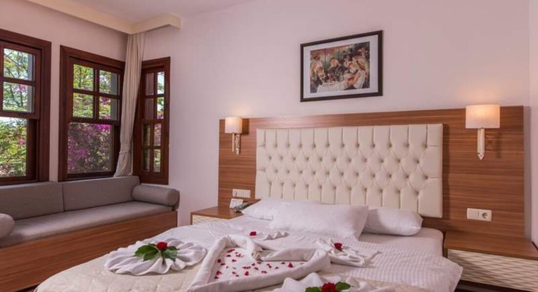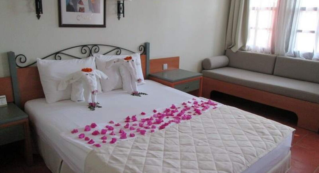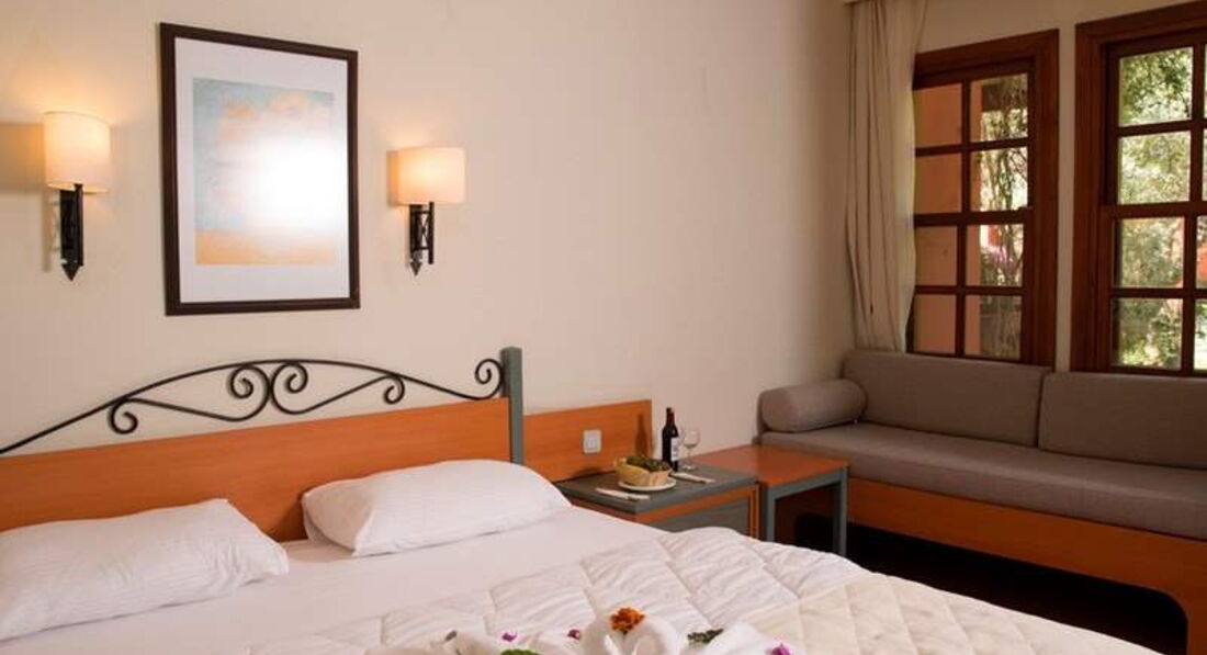 ОТЕЛЬ И СЕРВИС: Сам отель - это своего рода утопающий в зелени коттеджный поселок. Лучше выбирать коттеджи подальше от бассейнов и амфитеатра - будет потише. Номера не новые, но в порядке. Кровать, диванчик, в ванной всё работает. От комаров они на окна поставили сетки, насекомых в номере не было. Оставлял уборщицам 1-2 лиры каждое утро, они исправно крутили гусей и засыпали постель лепестками. Пару раз не сменили полотенца, но мы этим не загружались.