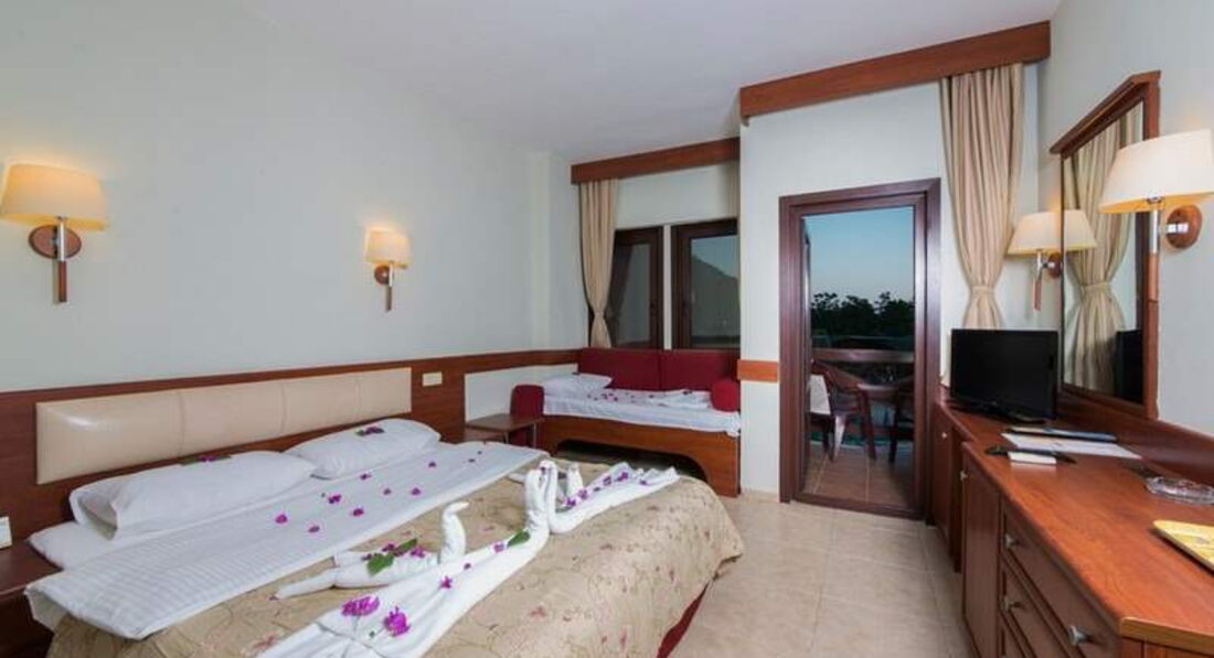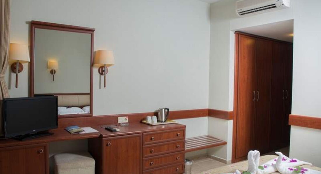 Недавно вернулись с этого отеля отдыхали с 8.05.17 по 15.05.17 приехали в отель где то в 10-00 утра,сразу заселили ,т.к. были свободные номера (начало сезона),номер нормальный, мебель в нормальном состоянии я б сказала даже новая ,чайник хороший (кофе чай сахар прилагается) минус в номере душ который встроен сверху и нет лейки)есть и дверь балкона и так же окна на который есть сетка ,советую взять фумигатор....питьевую воду выдают в бутылках по 1,5 литра в любом баре сколько хочешь раз за день...убираются хорошо (оставляли чаевые по 5 лир ) полотенца белые,пляжные были без залога...