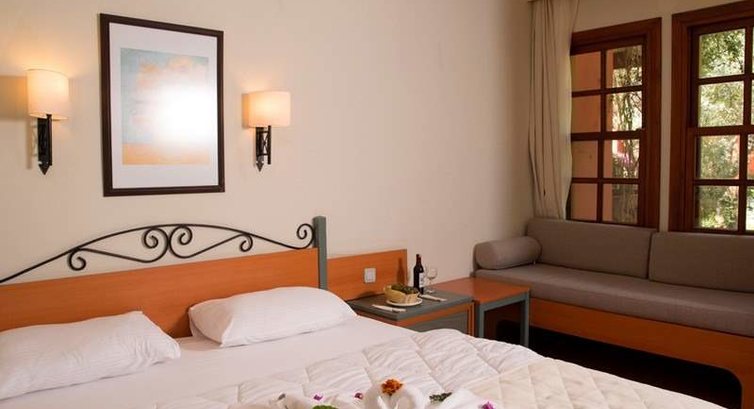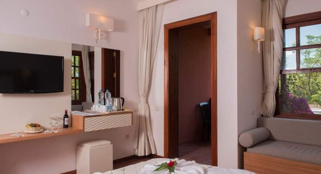 Номера есть разные, потому, что располагаются в разных корпусах, на разных этажах и т.д. Нам достался хороший номер в главном корпусе с видом на бассейн на втором этаже (возможно это тоже заслуга Ирины). Номер небольшой, метров 15 максимум, но очень уютный. Мебель новая. Свой кондиционер, ванна (душ намертво прикручен, закрывается стеклами, как душевая кабинка). Унитаз с встроенным биде. Фен, раковина, все чистое, добротное. В комнате большая кровать , диванчик, маленький столик, пуфик, встроенный микрохолодильник, телевизор плоский 20-21 дюйм где-то. Один русский канал "РТР Планета". Еще в номере был балкон, замечательный, по площади как половина номера. На нем 2 пластиковых стула и полотенцесушители на стене. Днем на нем можно загорать, так как легко укладываются 2 надувных матраса, мы их там и держали. Комары вечером присутствуют, поэтому включали фумигатор. Муравьишки бегали по балкону, но в номере не наблюдались. Уборка была ежедневная со сменой белья и полотенец. Оставляли бакшиш 1$ или 2 лиры. В номере особо не находились, это было бы грешно при такой природе снаружи. Лечь раньше 12 ночи в подобном номере не получится, т.к. амфитеатр находится в 10 метрах от балкона и музыка пробивает даже стеклопакеты, но для нас это не стало неудобством.
