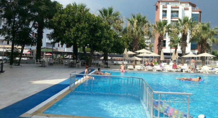 Отдыхали в этом отеле в июле 2014г. Море в 3 минуты ходьбы, лежаки покупали за дринк , стоило 5-8 лир (2.5-4 $ ) на весь день. Пляж чистый-песочек, море шикарное. Приехали поздно вечером, заселили сразу, в номера без балконов((((- пожалуй это было самое ужасное.Номер потом поменяла за $, зато потом был шикарный номер с видом на бассейн и море. Кстати пока я была на 2-ом этаже в номере без балкона - при уборке каждый день меняли полотенца и оставляли мыло и шампунь, как только переехала на 4-ый этаж - видно косметические принадлежности кончились, заодно и полотенца приходилось спрашивать- скажешь - дадут, жаловаться не ходили. Кондиционер исправный, мебель новая, телевизор, фен - всё есть. Убирают не на отлично, но сносно. Кормили очень прилично - мясо, рыба присутствовали, из фруктов - арбузы, дыни, сливы, апельсины -сколько хочешь. Если кто жалуется на недостаток питание - плиз в кафе- там за 10$ можно заказать огромную тарелку курица с гарниром. Мы голодные и при отеле ни разу не остались, повар улыбчивый, всегда присутствовал на ужине. Персонал по русски не разговаривает, только сам менеджер отеля знает русский, но он не всегда на ресепшен бывает, так что мы изъяснялись на полуанглийском и жестами. Территория отеля небольшая и уютная, каждое утро наблюдала как убирают территорию, чистят бассейн, ухаживают за растениями. Если бы не наши туристы, которые каждую ночь гуляют, пьют и орут у бассейна - было бы спокойнее, кстати слышимость в номерах хорошая. До бар стрит идти по променадной дорожке вдоль моря минут 20-25 - вот там настоящее веселье, и много много хороших магазинов с товарами. Экскурсии брали через дорогу от отеля, там много разных бюро, всё без обмана и дешевле чем у гидов. Если идти в сторону Ичмелера - будет два аутлета с товарами по фиксированной и приемлемой цене. А торговаться с турками....Для примера - в магазинчике присмотрела шорты - сначала стоили 37$- поторгававшись - столи стоить 25$, не стала покупать , а в аутлете эти же шорты стоят всего 29 лир (около 15$ ) - так что сами решайте что выторгуете, может оказатся ещё дешевле в другом месте.