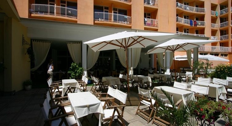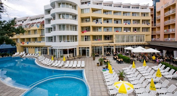 Теперь по территории отеля. Территория маленькая, как в основном и во всех болгарских отелях, но уютная. В бассейне не купались, вода была холодной, ходили только на море, иногда по 2 раза в день. До моря идти 5 минут развальным шагом, вдоль торговых точек, где часто еще больше замедляли шаг. Ходьба до моря не напрягала, шли, общались, не замечали, как были уже на море. Лежали на песке, что совсем не напрягало (так как стоимость лежаков была очень высокой). Мы купили себе зонтики (один 10 евро стоит), специальные покрывала (6 евро, которое потом удобно складывалось в сумочку) и чувствовали себя не хуже, чем остальные (все это потом забрали с собой домой). Море было теплое, из воды не вылизали )))), пару дней были сильные волны, мы на них прыгали с детьми, и несколько дней были водоросли вдоль берега. Еда в отеле очень хорошая, вкусная, разнообразная (курица, свинина, ребра, рулька, рыба 4 видов (и филе и кусками), овощи жареные, макароны, картофель фри, разные свежие овощи и салаты, супы (крем супы, обычные и холодник) всем всего хватало и детям и нам. Пару раз было мороженое. Молоко слабо было похоже на молоко. Кофе, чай из автоматов, нормальный, нужно нажать кнопку и подождать, т.к. автомат "думает" пару секунд прежде, чем выполнить функцию. Утром были блины (за ними всегда была очередь), так же овощи, колбасы (не очень вкусные), яйца, сосиски. Раз в неделю был тематический ужин. Фрукты: арбузы и дыни были ну очень вкусные, еще из фруктов были сливы, яблоки, апельсины. Мало было сладостей, на «полдник» давали печенье. Никто из нашей большой компании, не отравился за 2 недели отдыха, и не остался голодным. Занимали по 2 стола рядом, места, как правило, были всегда, кушали на улице, т.к. в помещении было жарковато. Пиво хорошее, вино белое разбавляли спрайтом (и получалось очень даже вкусненько). Спрайт, фанта, кола тоже были нормальные, вкусные. Воду в номер и на пляж покупали обычную газированную в ларьках (когда шли на пляж, стоила 1,5 л бутылка около 1 евро). Также часто покупали кукурузу (уж очень она у них вкусная, мороженое на пляже). Еды хватало очень, поэтому в кафе не ходили, пару раз когда гуляли вечером по городу, покупали пиццу перекусить... и заходили в "Бургер кинг" ))) Также посещали детский парк аттракционов (но там все дорого по 5 евро обычный надувной батут, и детская карусель "собачки" тоже 5 евро, автодром 6 евро). Ездили в аквапарк в "Солнечный берег", все понравилось, хорошо отдохнули. Также ходили на рынок, покупали специи, магниты, гуляли до магазинчика, где мужчинка с дочерью продавали разную косметику и вина собственного производства (там и специи, и мыло, и крема и вино было дешевле). И еще ходили в магазин "Младость" там покупали вино себе домой, чипсы детям и еще какие-то мелочи. Отдых очень понравился, отдохнули отлично, отель очень хороший, соответствует полностью цена=качество, за небольшие деньги мы отдохнули супер!!! И читая перед отъездом отзывы, я уже готовилась к самому худшему, но все же наделась на лучшее)))). И поняла одно, сколько людей, столько мнений, каждому не угодишь, и люди хотят за 1300 у.е. летом втроем съездить отдохнуть на 2 недели, и чтоб за ними "сопли" подтирали, кланялись, и икру красную наверно хотели кушать ))) раз они такие молодцы приехали в Болгарию))). И если вы едите сразу на отдых с плохим настроением, и характер у вас такой, что вы везде ищите проб