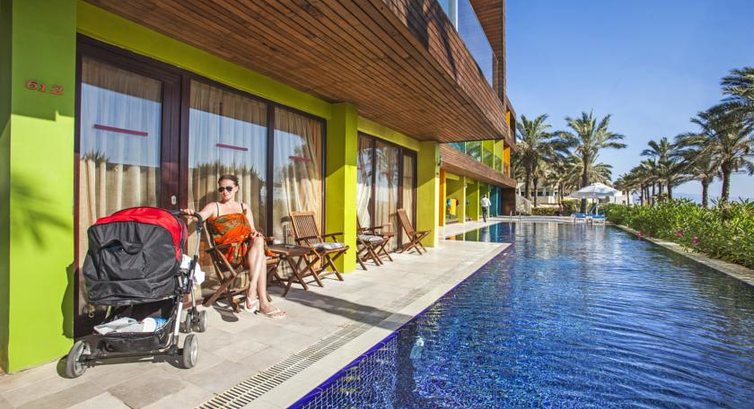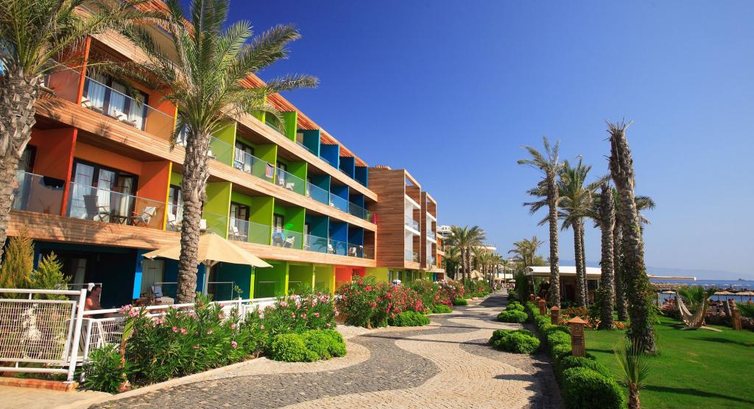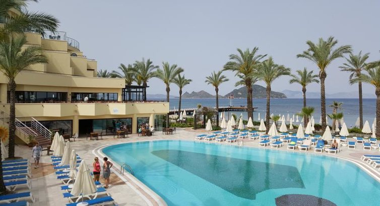 Шикарный отель , с 1 береговой линией , бассейном , горками , прекрасной красивой территорией , рядом с центром , прекрасная набережная по которой можно спокойно гулять , брать на прокат скутеры и кататься по ней , питание шикарное , огромное количество фруктов ( арбуз , дыня , черешня , слива , абрикосы и.т.п ) море сладостей , большое количество рыбы , разного вида на обед и ужин , поехали бы в этот отель снова . Рекомендую сходить в СПа салон , в отеле , на массаж и пилинг , делают очень хорошо , не пожалейте денег .