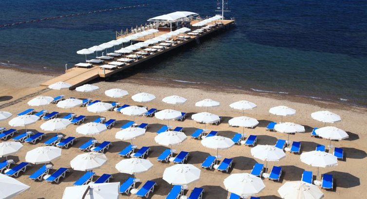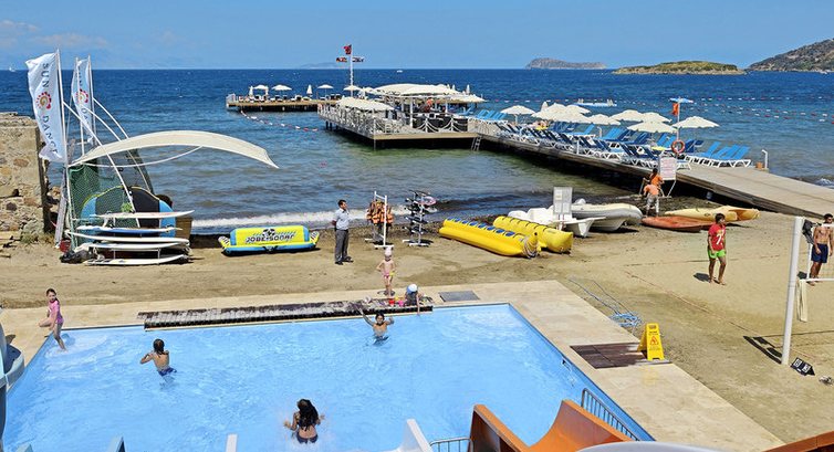 Выбрали этот отель,исходя из того.что он единственный в Бодруме,где предлагалось проживание 6х человек в одном номере одновременно. На сайте размещены фото огромных номеров(110м2) с двумя комнатами и гостиной. Каково же было наше разочарование,когда после двух часов трансфера,а ехали мы,действительно,так долго и тяжело("спасибо" встречающей компании IATI), на ресепшн девушка с большими пустыми глазами сообщила,что в этом номере технические проблемы. Мы заставили ее звонить менеджеру ,которая уговорила хотя бы посмотреть номера взамен. Время было позднее,усталость и двое маленьких детей сыграли свою роль. Надо признать,что номера оказались замечательные. Гостиная, спальня с шикарной кроватью,ванная за стеклом,как тут уже писали..Гели,шампуни и тд.-всего этого было в избытке. Номера убирали каждый день. На нашем этаже были замечательные уборщики,этажом ниже ,где поселили мою сестру с ее семьей порой "забывали" положить шампуни,гели, мочалку дали только после напоминания. Что по мне,то это такие мелочи ,когда рядом такое замечательное море и пляж. Пляж песочек. Заход в море можно считать неплохим,если бы не водоросли,которых было прилично,хотя их и убирали постоянно. Мы заходили с пирса. Надо отметить,что Эгейское море довольно прохладное,и часто бывали волны. Детям не очень хотелось лезть в такую воду,они больше времени проводили в бассейне. Здесь два больших и два детских бассейна. Они чистые,возле одного из них уже к концу нашего проживания заработал бар.