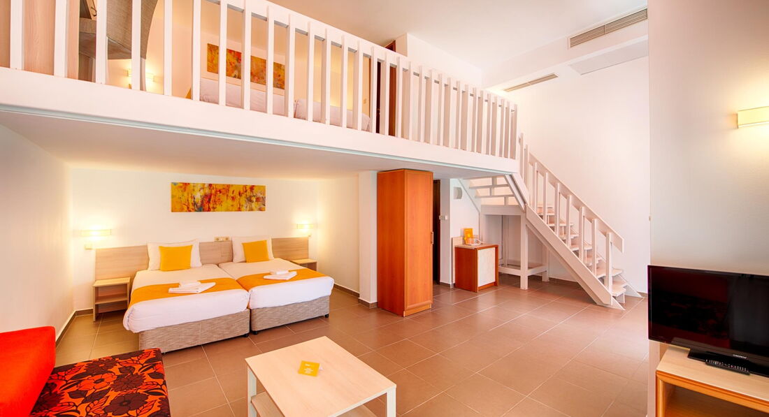• Maisonette (дворівневий номер зі сходами, з 2 ліжками та диваном для 2 осіб на 1 поверсі, 2 ліжками на 2 поверсі, без виду на море, макс. 6 чол.)