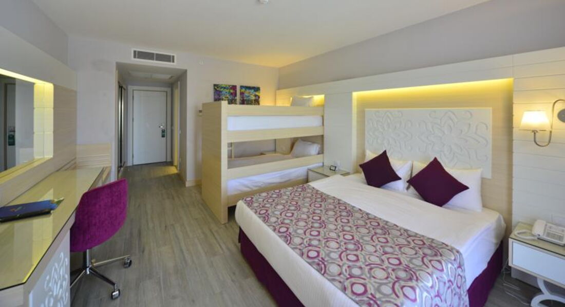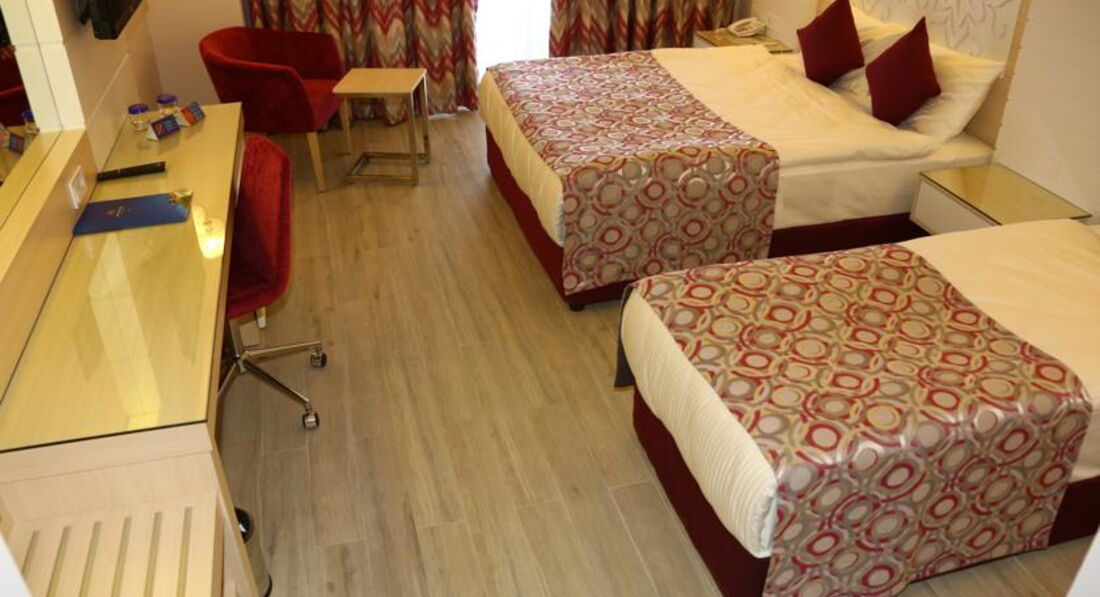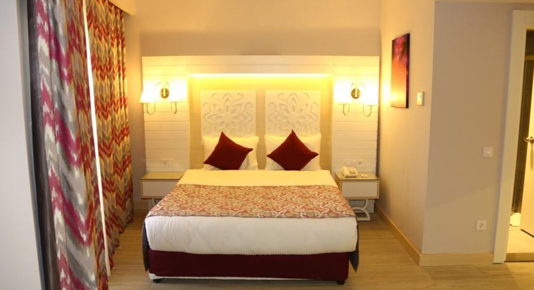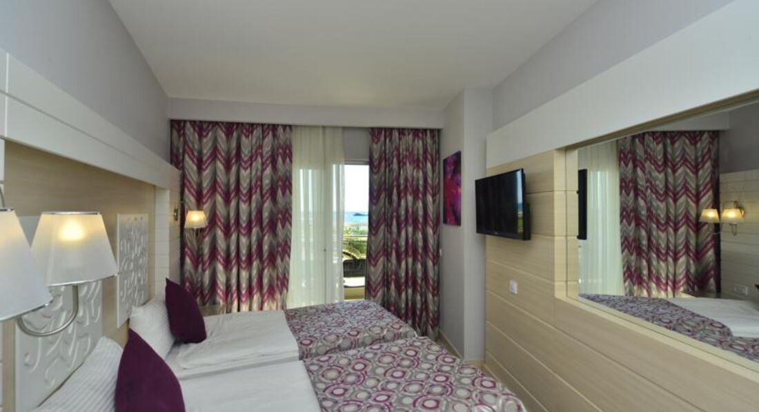 У нас было сравнительно позднее прибытие около 17 часов, встретили очень приятно, заселение произошло быстро, с бокалом игристого вина. Выдали оранжевые браслеты UALL, есть еще синие ALL, разница в круглосуточном лобби-баре, мелочь, а приятно утром перед завтраком выпить бутылочку фруктового игристого вина. Номера, категории стандарт трехместные, получились с видом на соседний не работающий из-за экономии корпус, но зато с большим балконом, номера с видом на море в отеле имеются, но они дороже и балкон небольшой, к тому же они всегда на солнце и может быть шумно от бассейна и от диско соседнего отеля. В номере ждали бутылка вина и тарелка с фруктами. На балконе столик, два стула, небольшая сушилка для белья. Номера как картинки с сайта отеля, пол плитка под ламинат, рекомендую легкие тапочки. Постельное белье и полотенца белоснежные, мягкие, пушистые и никаких катышков. Большие зеркала помогают навести красоту женщинам перед ужином, количество и расположение осветительных приборов также этому способствует. Мини-бар комплектуется только мин. водой, соком и лимонадом, пополняется по мере расхода. В ванной имеется фен, увеличительное зеркало на штативе и набор мыло, шампунь, гель для душа, кондиционер для волос, качество среднее, пополнялся поначалу плохо, после замечания на ресепшн принесли столько, что ставить было некуда. Чайного набора, к сожаленью нет. Телевизор 32 дюйма, каналы русские имеются, читает флешки с фильмами. Кондиционер, жаль, что без пульта, т.к. централизованный, но довольно бесшумный и эффективный. Дверные замки в номере электронные, карточные, на ресепшн запрограммируют необходимое вам количество ключей-карт.