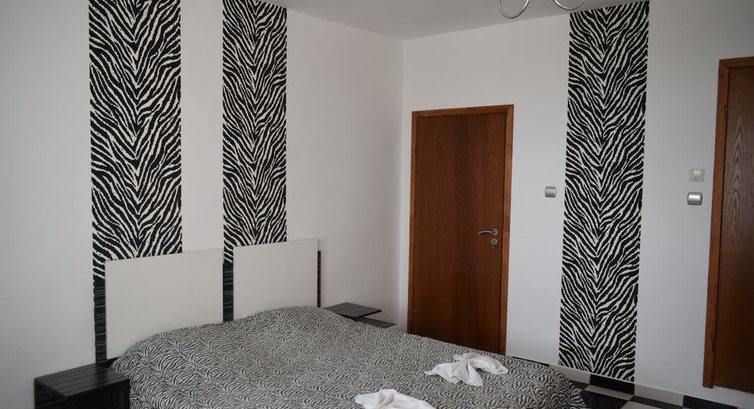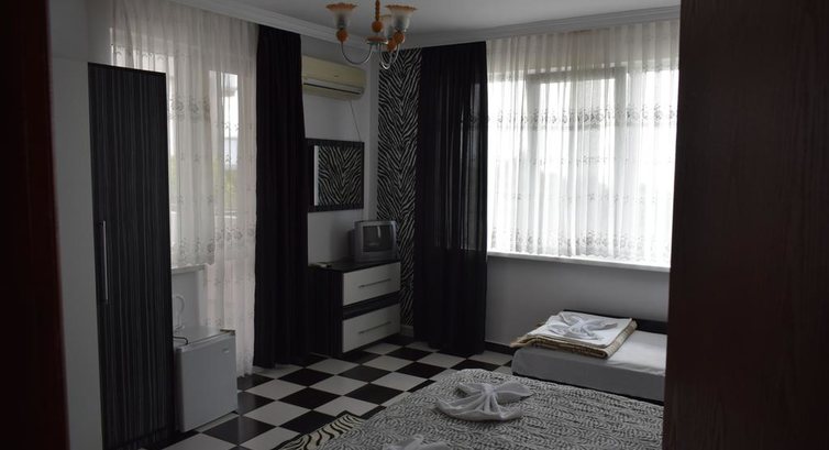 Комната №1 располагается на втором этаже направо и прямо. Комната красивая, в чёрно-белых тонах, просторная, уютная. Одна большая двухспальная кровать и одна маленькая односпальная. На полу плитка. Есть телевизор, мини-бар и чайник. Кондиционер за дополнительную плату (надо заранее договариваться с туроператором). Большой шкаф и комод, 2 тумбочки. Также есть балкон с электрической плиткой, кастрюлей и верёвками для сушки. Есть набор посуды - нам было удобно готовить. Минус: нет плотных штор, одни занавески. В номере туалет вместе с душем. Минус: неправильно сделан слив, из-за чего после мытья лужа растекается по всему полу в ванной.