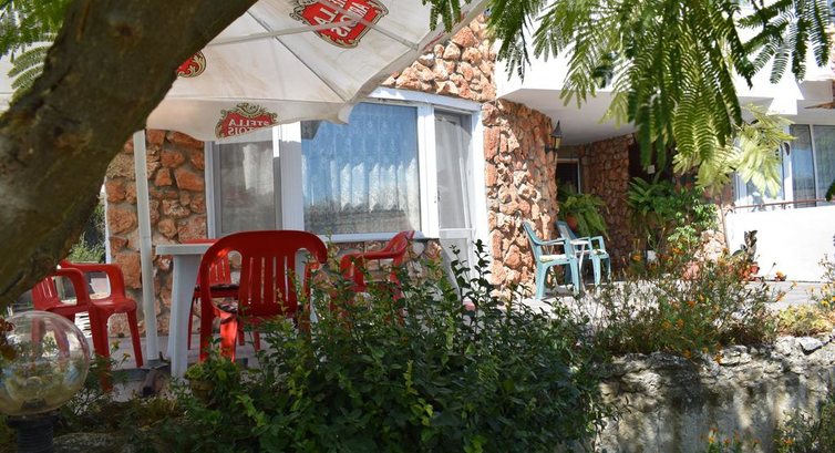 Территория вокруг отеля небольшая. Есть беседка и мангал. На территории живут куры, петух и собака. В комнате №2 может быть очень сложно уснуть из-за гавкания собаки, крика петуха и кур. За территорией расположен цыганский квартал - от них тоже много шума. До пляжа относительно недалеко, но весьма высоко подниматься - GPS показывает 57 м над уровнем моря.