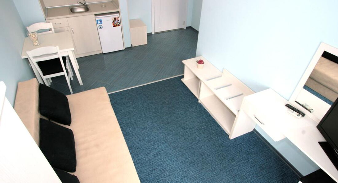 One Bedroom Apart. - спальня з двома односпальними ліжками, суміжні двері, вітальня з розкладним диваном, кухонний куточок з холодильником (немає можливості для приготування їжі), обідній стіл, ванна кімната з душем, макс. 4 чол., 40 м2.
