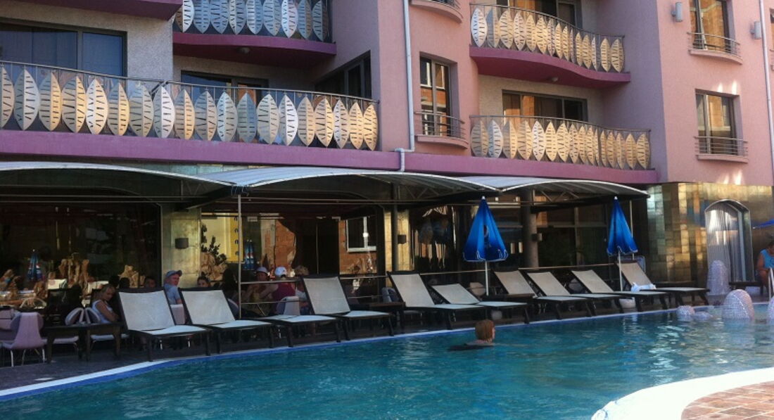 Харчування - одноманітне (ми були на All). На сніданок (всі 10 днів одне і те саме, нічого нового) - яйця варені, смажені, сосиски, сардельки, бекон та напівфабрика на грилі, шоколадні кульки, кукурудзяні та вівсяні пластівці з сухофруктами (відсирілі), молоко, джем, шоколад та мед, 2 вида сирів, булочки або хліб білий, масло ( болгарський маргарин), круасани, яких дуже часто не вистачало, та огірок-помідор, чай без лимона (бо чомусь його ніколи не було) та апаратні розведені гарячі напої. Обід - той хто прийшов на 12.30, той, ще мав великий вибір гарніру та чогось кращого до нього, хто пізніше - той сам собі винен, фрукти - мало, лише одного виду - або персики, або абрикоси, які потрібно було випрошувати у персоналу, бо вони мають серйозні наміри щодо економії продуктів. Полуденок - 3 рази дали найдешевше морозиво по 2 кульки, а інші - круасани ранкові та печиво в малих кількостях. Вечеря - хто швидше - той молодець, хто пізніше - їсть тушковані овочі з хлібом (4 із 10 разів на гарнір була лише картопля фрі, якої катастрофічно не вистачало для всіх, з фруктами така ж історія, що й на обід. Щодо спиртних напоїв, то частенько таке траплялось, що їх просто не було, закінчилось і все..., завтра буде, бо багато п"ють.... Ракія, вино та горілка були розведені спиртом.