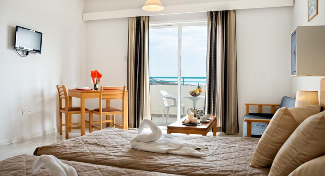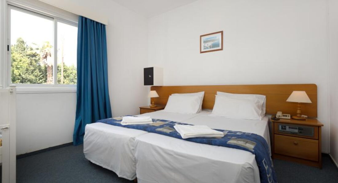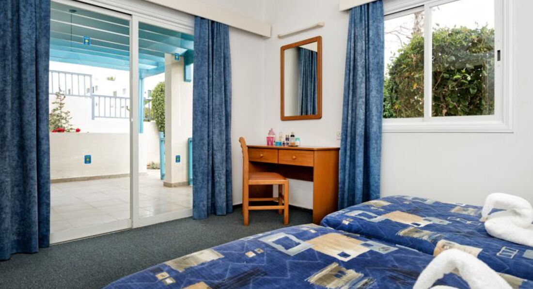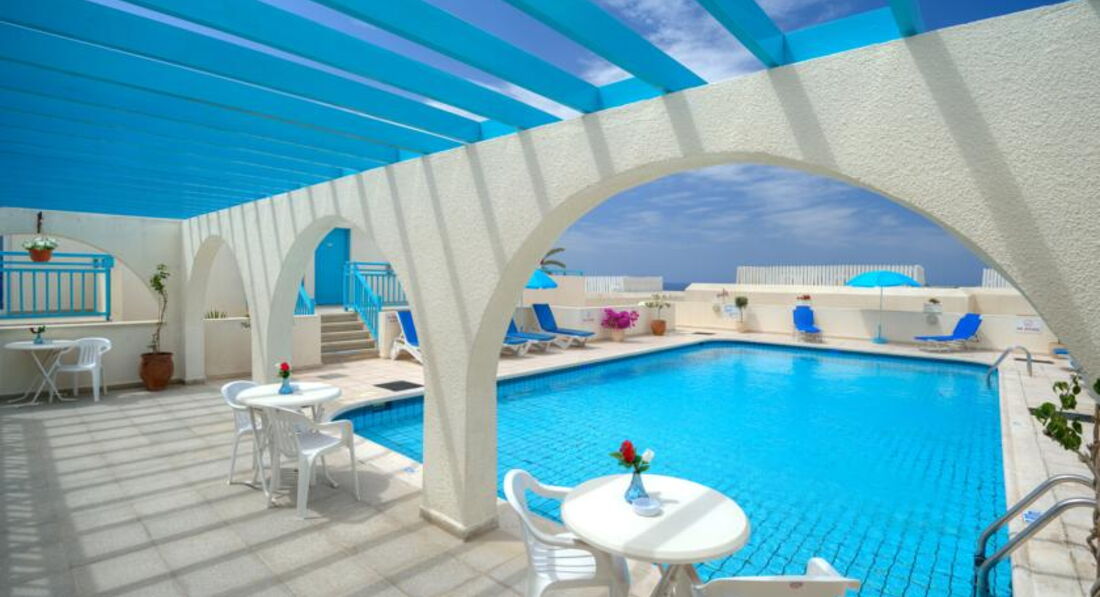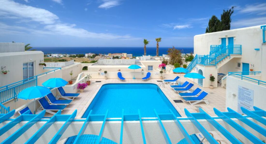 Отдыхала в этом отельчике в сентябре 2011. При том, что Кипр мне в общем и целом скорее не понравился - отель + море оставили приятные ощущения о поездке. Отель очень демократичный и очень не пафосный. У меня были апартаменты: комната с большой кроватью и диваном, небольшая кухонька (холодильник, плита, чайник, тостер - все работает, полный набор посуды), террасса со столиком и двумя удобными стульями. Телевизор с двумя русскими каналами. В каждый номер отдельный вход, соседей видно и слышно только у бассейна и за завтраком в баре. Дизайн.... Милый)))) Реально средиземноморский стиль - бело-синие тона и дерево. Очень красиво и уютно. За 10 моих дней белье меняли один раз, полотенца - через день. Вода есть всякая и всегда, это даже не обсуждается. В бассейн не ходила. Там в основном англичане - помпезно возлегающие на шезлонгах. Бассейн небольшой, но чистенький и достаточно глубокий.