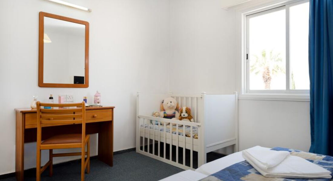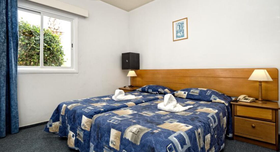 Спальня: две кровати, прикроватные тумбочки - в одну встроен будильник/радио, кондиционер, зеркало, туалетный столик, сейф (1 евро в сутки).