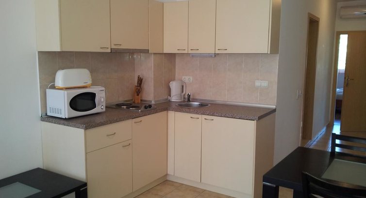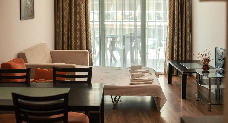• 1 Bedroom apartment (3+1; 4 max) - 68 кв.м, вітальня з кухонним куточком (плита, мікрохвильова піч, раковина, холодильник, кухонне начиння), спальня з двоспальним ліжком, розкладний диван у вітальні, балкон