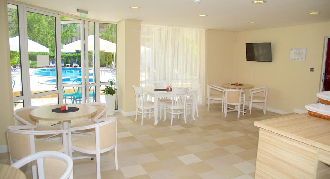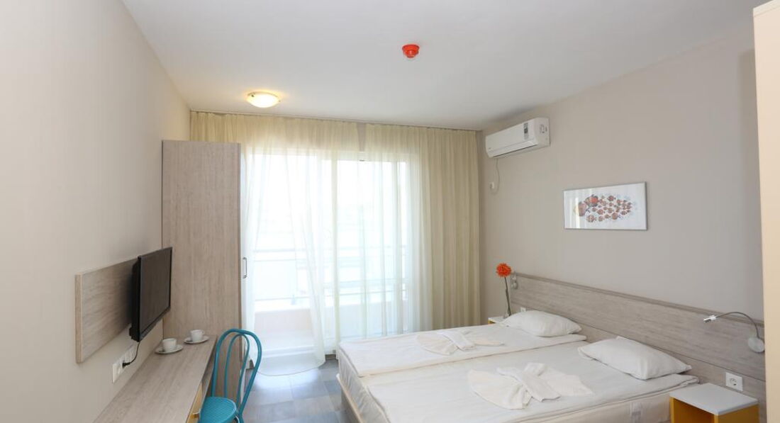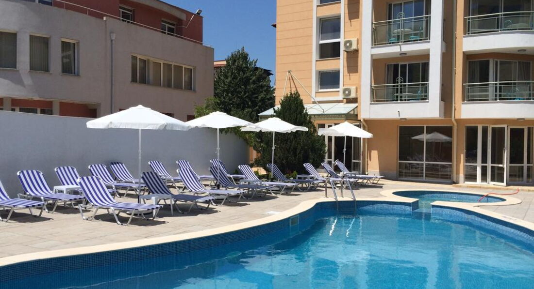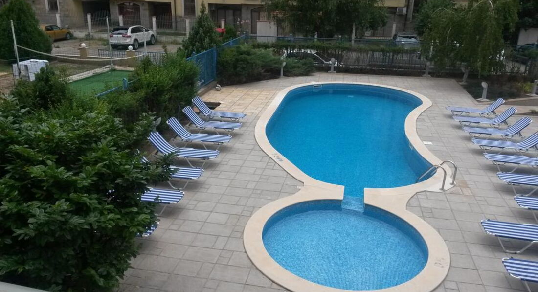 Отель почти новый, мебель в идеальном состоянии, сантехника работала , у нас был номер студио на 2 человека, в номере посуда,микроволновка,фен,телевизор с русскими каналами, кондиционер,сейф на ресепшене бесплатный, балкончик , сушилка для белья по запросу,чайник тоже. Если есть свой маленький чайник,то лучше взять с собой. Завтраки однообразные , но достаточно ,чтобы уйти сытыми , все чистенько. На территории бассейн , зелень и цветочки , приятная атмосфера. До моря 10-15 минут , шезлонги и зонт по 10 лев, можно на полотенце ,но там очень много народу . Валюту лучше брать-доллар.Остановка рядом, в супермаркет лучше ходить "Ваня "или "Жанет " ( 15-20 минут ходьбы) по типу нашего "Метро". Море чистое,но многолюдное.Посещали экскурсии самостоятельно или покупали у Олега ( вроде) ,как идти на пляж .Если будут вопросы отвечу.