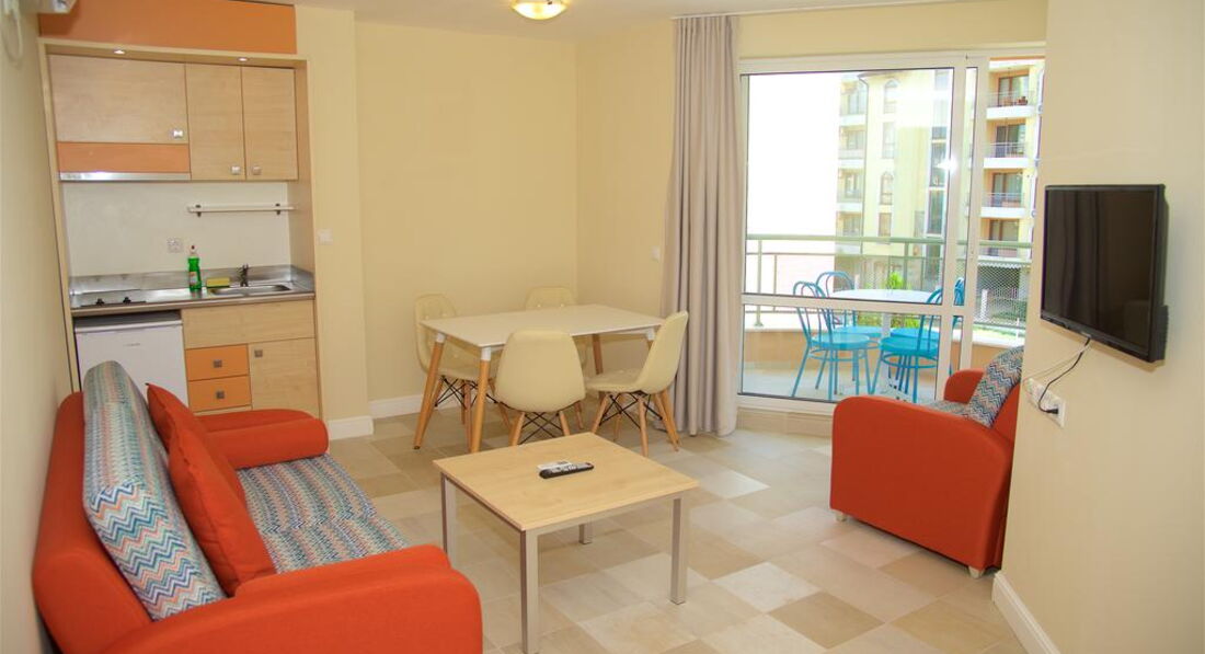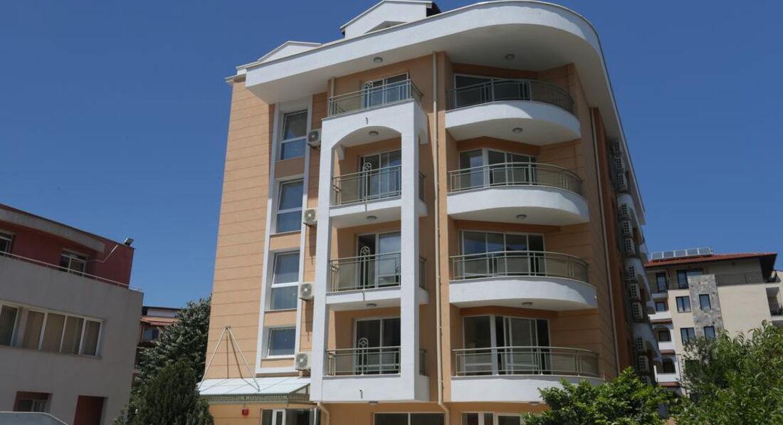 Апартаменты расположены в более спокойной части Солнечного берега,но вся инфраструктура рядом:кафе,бары, магазины,автобусная остановка.До центра можно проехаться на мини-поезде или пройтись пешком,около 15 минут.