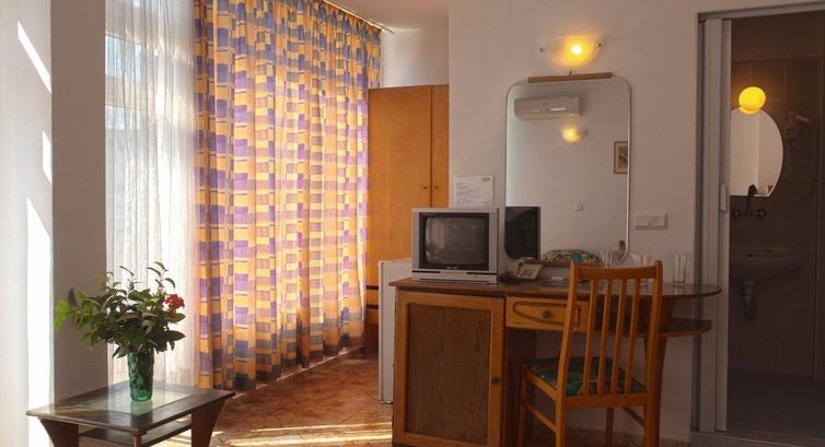 Отдыхали вдвоем с сестрой. Заселялись примерно за час до ужина. Хочу сразу обратить внимание, что отель - это пристройка к отелю Варшава с 2-мя звездочками. Как мы потом сделали выводы - разница только в номерах - все остальное - на 2 звезды! Начну с номера. Комната маленькая, рядом стоят две кровати, напротив холодильник и стол с малюсеньким телевизором. Перемещаться по комнате двоим одновременно - очень проблематично, у нас все ноги были в синяках после отдыха. Мебель, в принципе, нормальная, единственным минусом у нас была тумбочка, фасад которой оставался в руках при открытии. Холодильник стандартный для отелей, только стоял отдельно (не спрятан в тумбочку, как это обычно бывает), работал исправно.