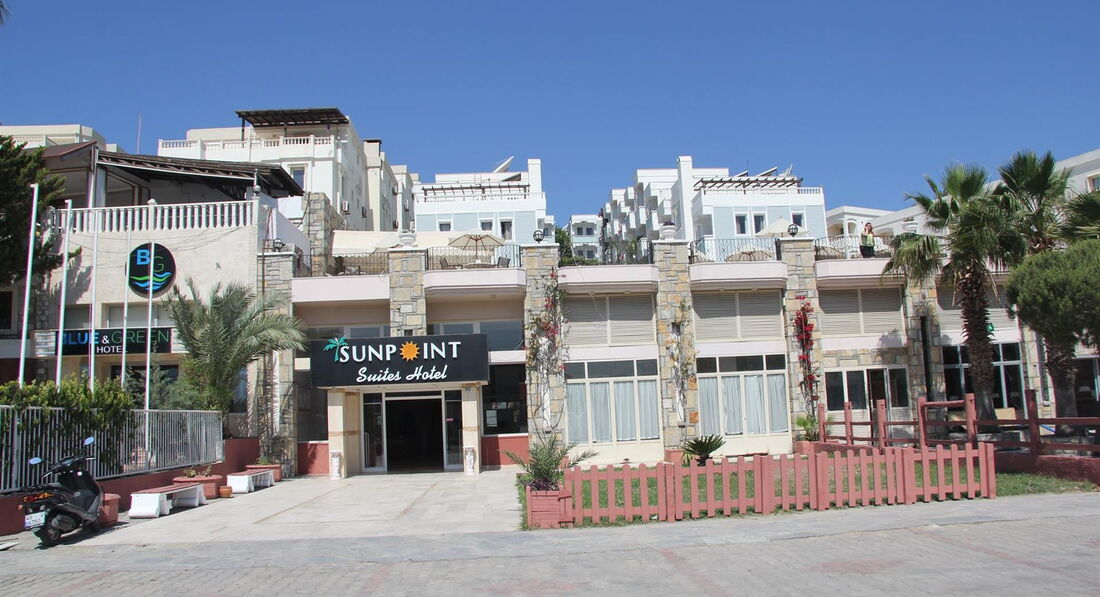 Готель Sunpoint Suites розташований у Гюмбет, всього за 200 м від пляжу, за 40 км від аеропорту Мілас, поряд з магазинами, ресторанами, барами.
