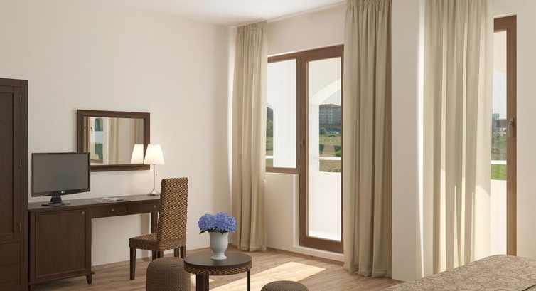 Отдыхали в данном отеле с 5 по 12 июля. Бронировали стандартный номер. Так как, это аппарт-отель, то в стандартный номер входит комната со спальней и вторая комната с кухнонным уголком. Есть электрическая плита, с двумя комфорками, холодильник и стиральная машина. В большой комнате - телевизор, есть русские каналы. В шкафу, в спальне, стоит сейф. Олата за пользование сейфом - на ресепшене. За неделю - 30 лев. Питание в отеле очень разнообразное, блюда на любой вкус. До города каждые 20 минут идет микроавтобус, стоимость 1 лев. Пляж 250 метров от корпуса, на пляже бесплатно лежаки и зонтики.