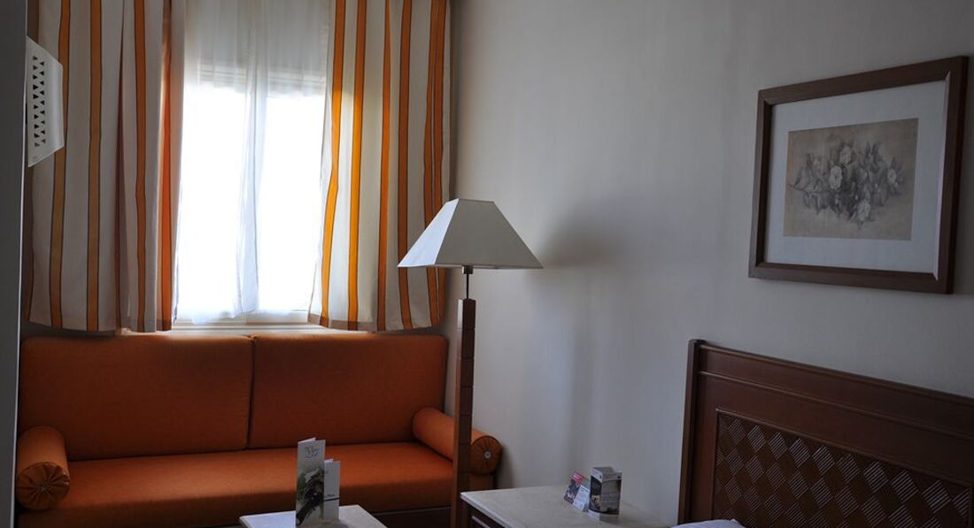Отель полностью заполнен. Но заселяли нас не долго, не больше получаса. Номер был с видом на море, там был большой балкон, вечером такая красота. В номере была нормальная мебель, телевизор, кондиционер, холодильник ,фен. Все работало хорошо. Конечно номер не новый, но в отличном состоянии. Убирались не каждый день, но убирались. Постельное белье и полотенце меняли, хотя у нас свои полотенца всегда, с собой возим.