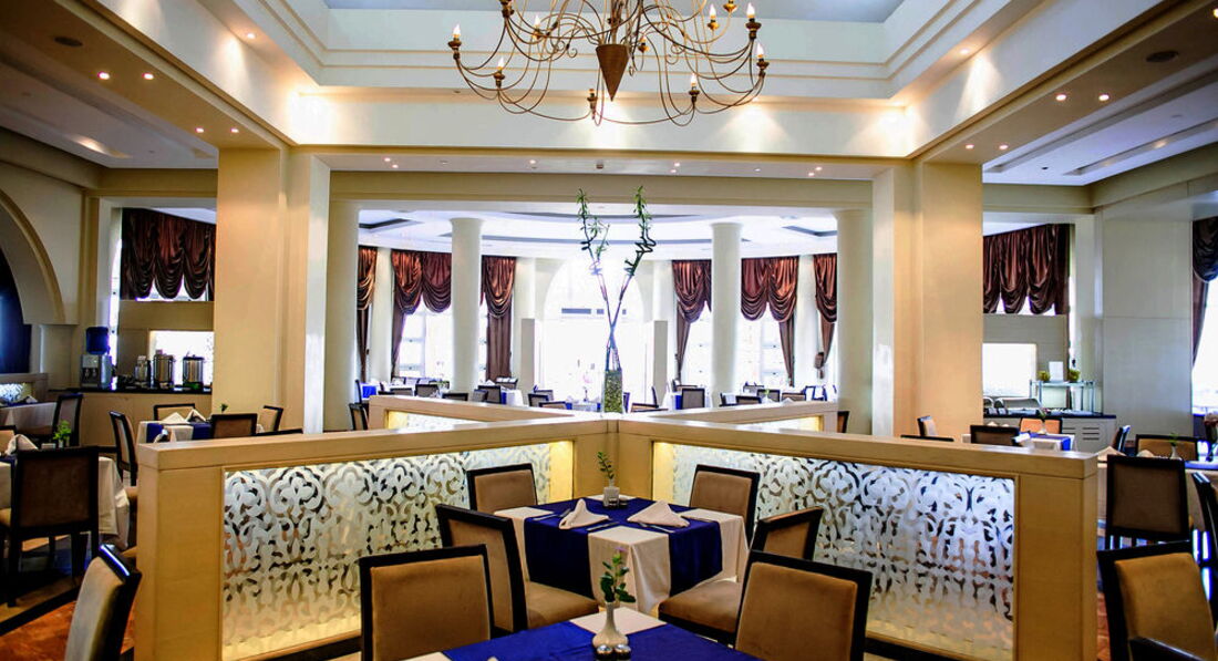 Бари та ресторани: До концепції All Inclusive входять безалкогольні напої з 10:00 до 00:00 години. Місцеві алкогольні напої подаються з 11:00 до 00:00. Після 00:00 усі напої – за окрему платню. Усі напої подаються у склянках чи чашках крім води, що подається у пляшках. Алкогольні напої особам, які не досягли 18 років, не подаються. Бари біля басейнів 10:00 до 18.00 Бар у лобі "Mashrabeya" 24 години; Бар на даху/Кальянна Blue Sky 17:00 до 00:00 (кальян за додаткову плату); Бар на пляжі Blue Bay 10:00 до 18:00; Безалкогольні & Гарячі напої та алкогольні напої включені в систему All inclusive.