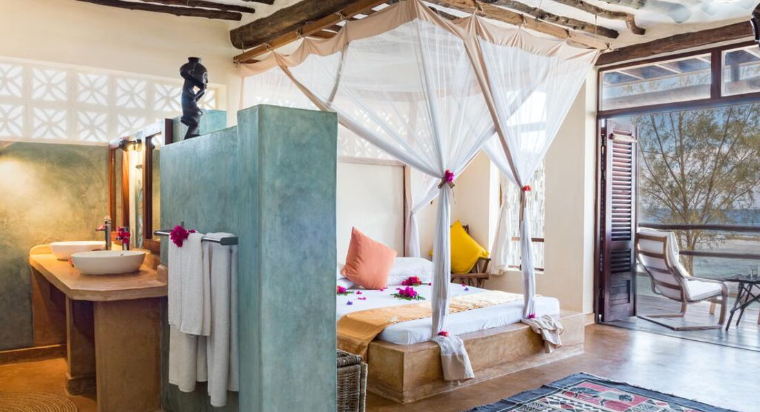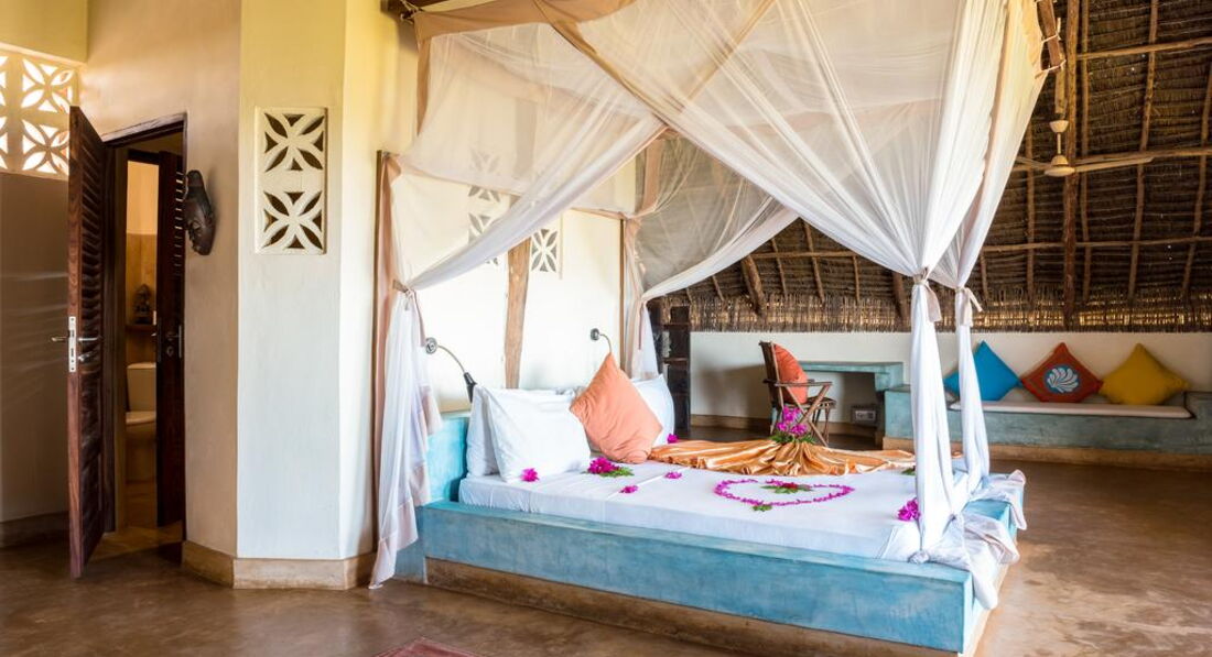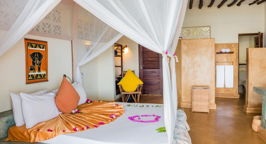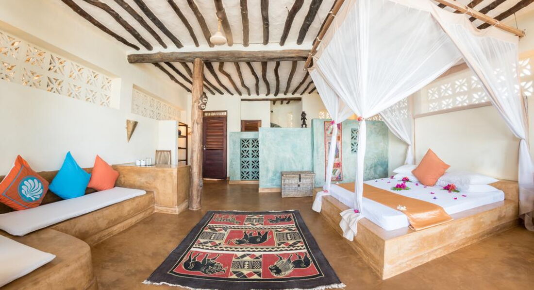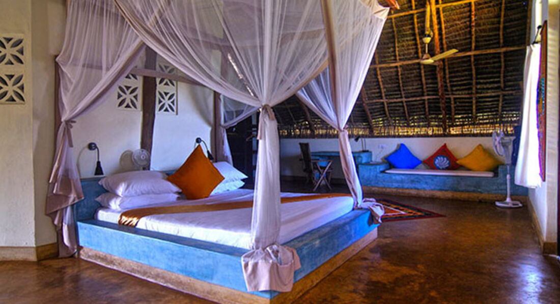 Blue Wave Suite (Номери, згруповані в блок на 4 номери, розташовані на височині прямо на пляжі, з номерів відкривається чудовий краєвид на океан і острів Мнемба. У кожному номері ліжко королівського розміру з великою москітною сіткою, ванною кімнатою з душовою кабіною та туалетом, ефективний стельовий вентилятор, сильним вентилятором для підлоги, невеликий приліжковий вентилятор, сейф, кам'яні лави покриті подушками, дерев'яна шафа. Усі номери мають просторий балкон або тераса.)