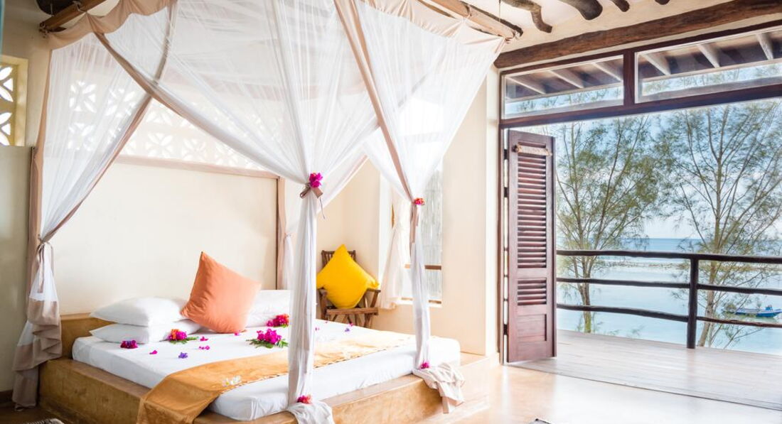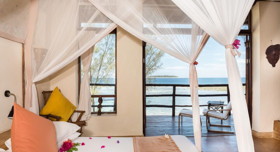 Panorama Suite (Номери, розташовані на другому поверсі над Blue Breeze Suite під колоритними солом'яними дахами з панорамним видом на океан і острів Мнемба. У кожному номері ліжко королівського розміру з великою москітною сіткою, ванною кімнатою з душовою кабіною та туалетом, ефективним вентилятором для стель, сильним підлоговим вентилятором, невеликий вентилятор, сейф, кам'яні лави покриті подушками, дерев'яна шафа. Усі номери мають просторий балкон або тераса.)