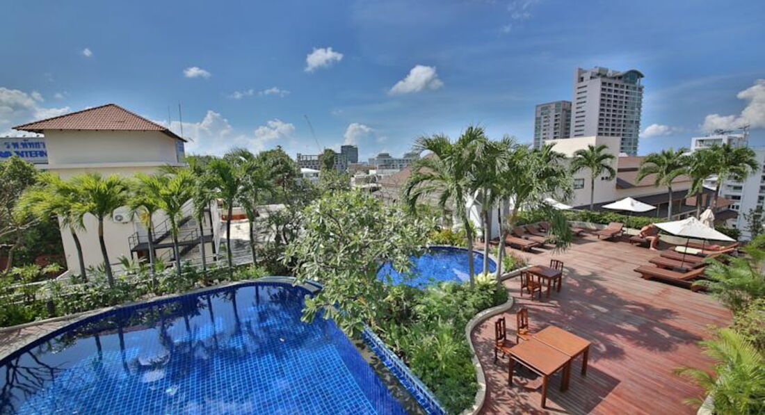 Самый главный плюс - это БАССЕЙН на крыше с баром и множеством зелени и пальм. Думаю мало отелей Паттайи могут похвастаться нормальным бассейном.