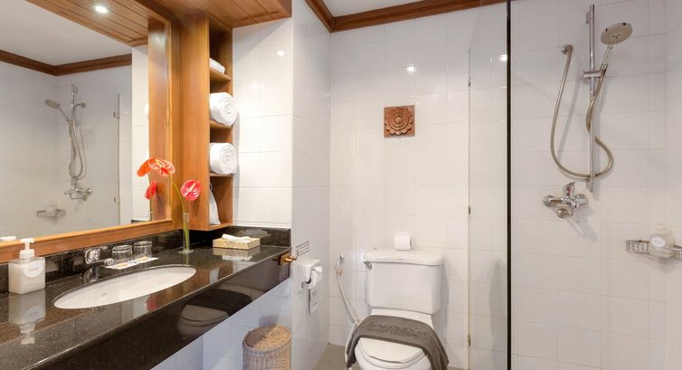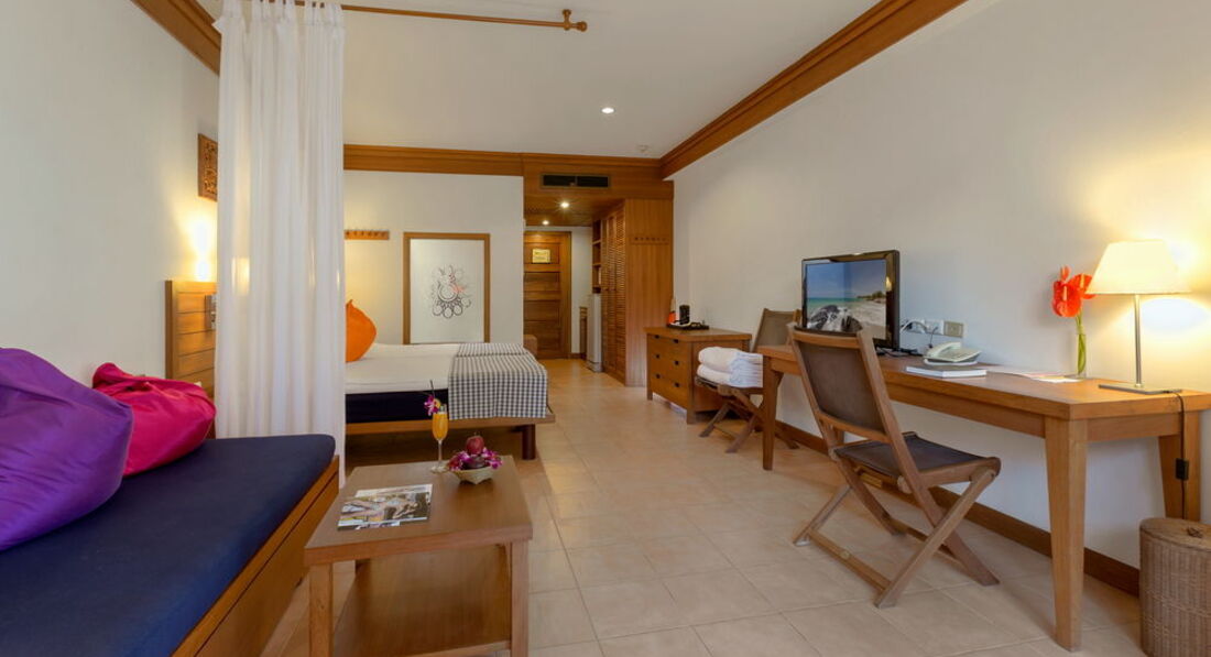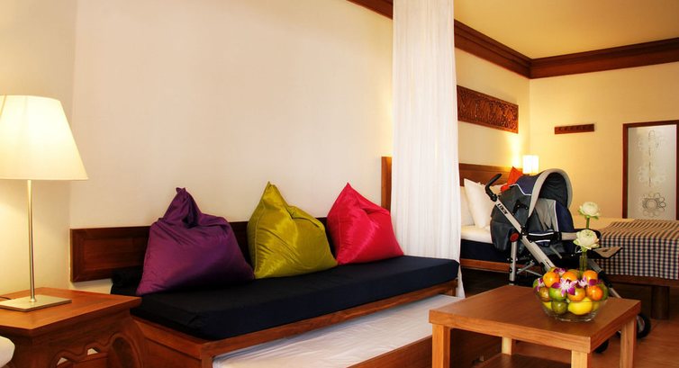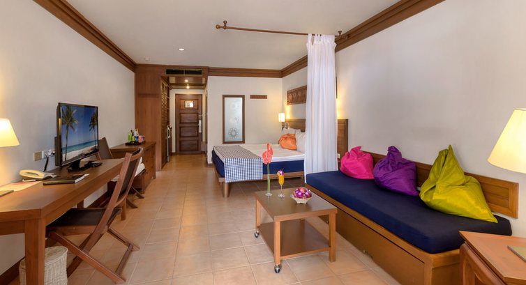 Номер большой, пол очень скользкий. Холодно от кондиционера. Мы дня через 2 только с ним ужились, выставив температуру на 26-27 градусов. Мебель старенькая, но все работает. Вечерами можно посидеть на лужайке перед номером уничтожая стратегические запасы из дьюти-фри. Там же, кстати, будете закусаны местными комарами, которых вообще неслышно, и которые кусают не больно. Просто потом все ноги в шишках. В целом, зря мы взяли Бэйби номер, учитывая, что главный бэйби с нами не полетел. Переплатили тысяч 20, наверное.