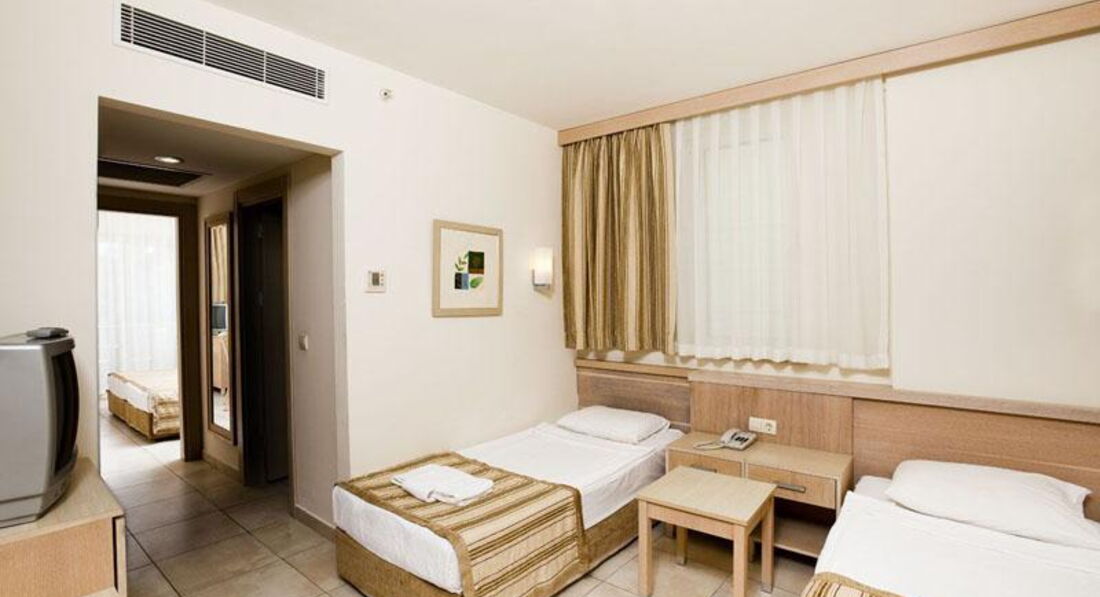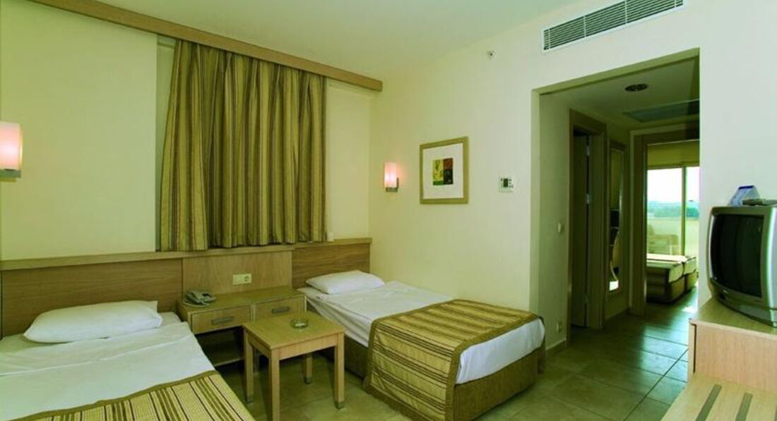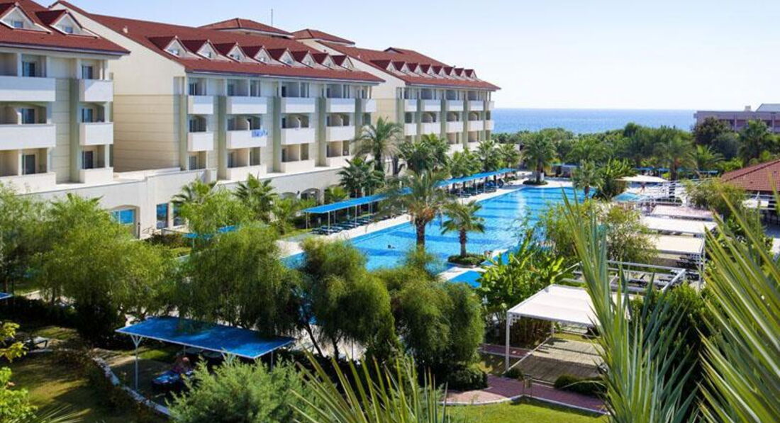 Отдыхала с дочкой 8-ми лет, папой и подругой с сыном 8-ми лет в период с 14.06.2012 по 24.06.2012. Летели компанией Руслайн от Тезтура. Путевку покупали за неделю-выбора в вылетах уже не было. Время вылета неудобное: туда в 14-00, обратно в 8-00. Самолет задержали примерно на час в Домодедово и минут на 40 в Анталье. Самолет А-319 чистый новый. Полет прошел нормально. Теперь про отель: самый большой недостаток для меня-это дорога на пляж. Метров 200 по солнцу, а очень жарко. вообще мелких недостатков много. Мы были настроены на море и представляли себе, что это БЮДЖЕТНАЯ 5 , поэтому на многое закрывали глаза. Но для некоторых эти недостатки будут иметь значение: не хватает приборов в ресторане, еда на троечку, но голодными не останешься, но экономия иногда просто раздражала, когда просишь 4 котлетки, величиной с бывший пятак, а он дает две, плохая уборка в номерах (белье не сменили ни разу, грязные полотенца с пола поднимают, сворачивают и кладут на полочку).