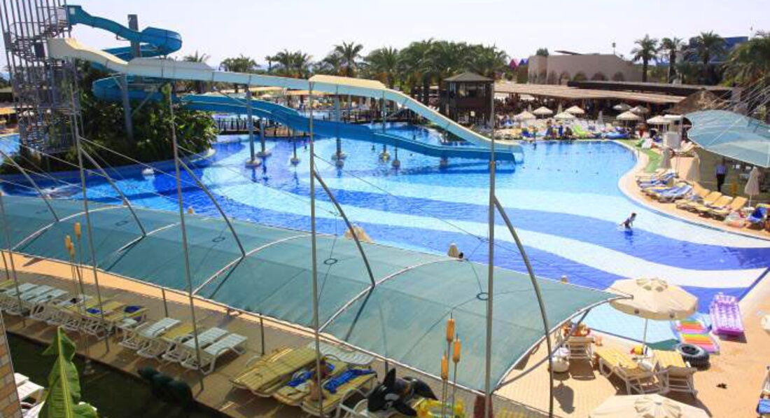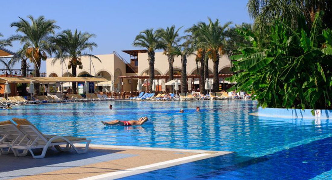 Бассейн огромный, лежаков масса, всем места хватает. Несколько детских бассейнов, водные горки для взрослых и детей. Пляж песчано-галечный. Всегда полупустой, т.к. европейцы тусуют у бассейнов. Есть ночной диско бар возле пляжа, в амфитеатре каждый день развлекательная программа.