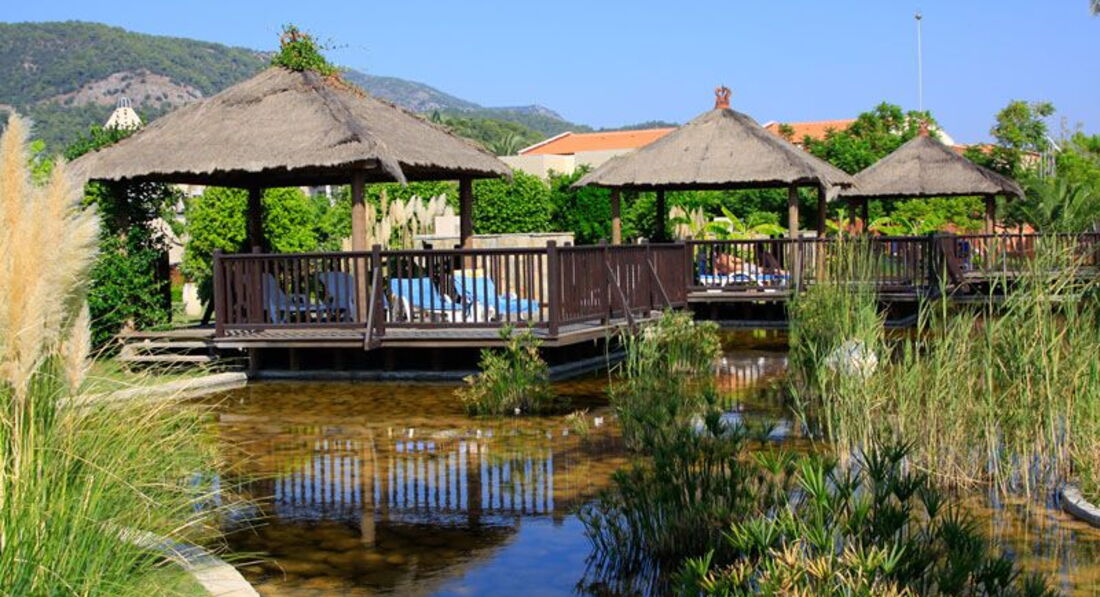 Отель понравился - большая зеленая чистая территория, очень приветливый персонал, вкусная еда. Очень понравилось то, что на пляже совсем мало людей, в отеле много европейцев и они в основном отдыхали у бассейна. Сыну очень понравились водные горки. Номер хороший, с ванной-джакузи, все чистенько и аккуратно, мебель новая. Нам достался вид на основной бассейн с горками, а вдали виднелось море! Рядом с отелем находится поселок Саригерме, несколько раз прогуливались туда на рынок.