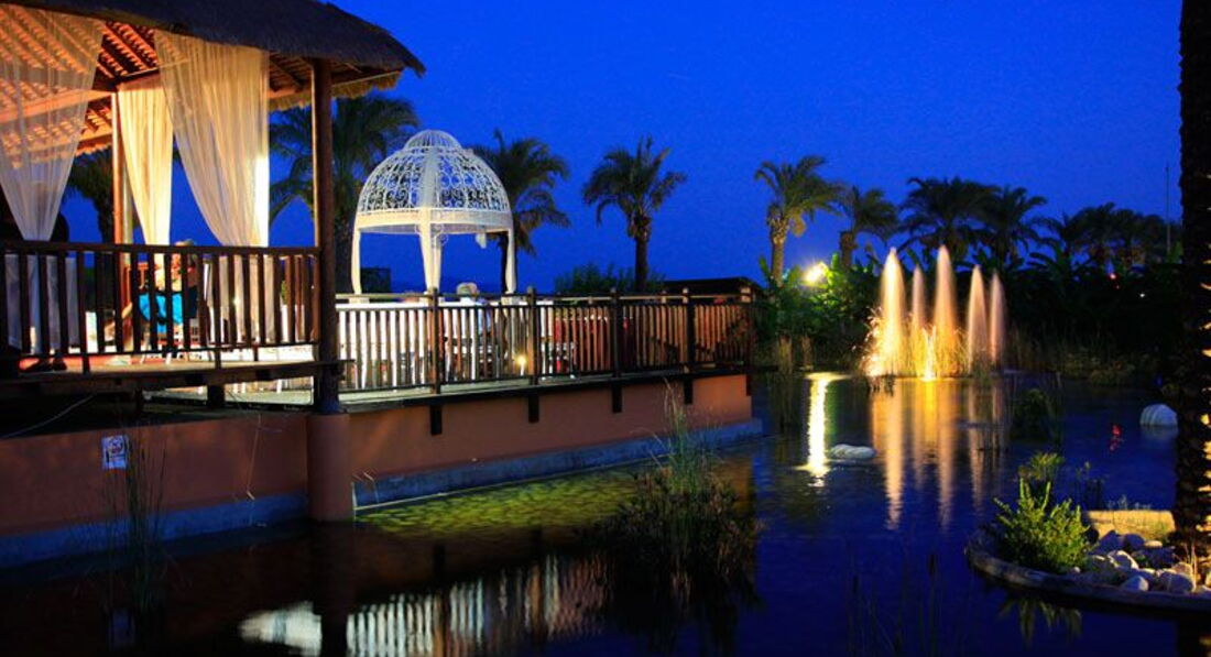 Очень красивая, большая зеленая территория.Есть где погулять,поиграть детям.Бассейнов я насчитал пять:первый основной с двумя большими водными горками и небольшой частью для малышей;второй для детей с детскими водными горками(их 3 штуки),третий детский совсем мелкий под навесом от солнца;четвертый релакс бассейн в отдалении около домиков с более дорогими номерами;пятый закрытый в помещении спа-центра.В открытых бассейнах вода была очень тёплой,в закрытом немного прохладноватая.Есть детская площадка с качелями и горками,детский клуб(работает до 17.00),игровые автоматы (за отдельную плату),футбольные поля,корты для тенниса,настольный теннис(бесплатно),несколько баров.Вечером есть детская дискотека (недолгая,около часа) на русском языке.Там же проходит диско для взрослых (с 23.00 до 02.00).Есть тренажерный зал и хаммам.WiFi бесплатно на всей территории и в номерах.С 00.00 до 07.00 часов всё в отеле (кроме WiFi)становится платным!На нулевом этаже главного здания большие магазины одежны,сумок,ювелирных изделий и т.д.