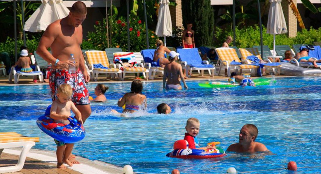 Англичане народ далеко не чопорный и консервативный (как нам преподносили в детстве)Скорее это викинги).Все в тату с ног до головы.Семьи 2 ребёнка минимум в основном трое .Тусят около бассейнов весь день,как с утра занимают так и до вечера и спят и едят вся жизнь-здесь.Так что если нужен шезлонг около детского бассейна,то надо занимать утром.