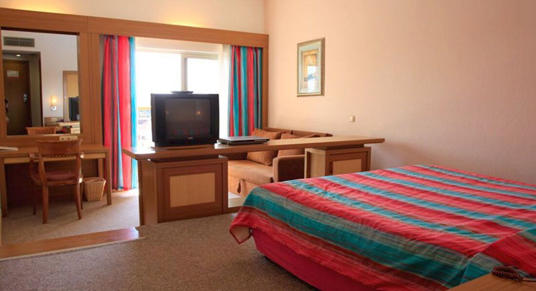 Размещением мы остались очень довольны. Наш номер джуниор-сьют оказался в тихом месте, вдали от бассейнов и всей "движухи", в то же время до пляжа идти было 5 мин., а до ресторана и ресепшен ещё ближе. Очень удобным был балкон - квадратный, просторный, с сушилкой для купальников, да ещё и красивый вид на горы открывался с нашего 3-го этажа. А ещё порадовало наличие москитной сетки на двери балкона. Номер был комфортным, из двух комнат, с двумя TV и двумя кондиционерами. Единственный недостаток - малюсенький шкаф за занавесочкой, а точнее, его подобие.