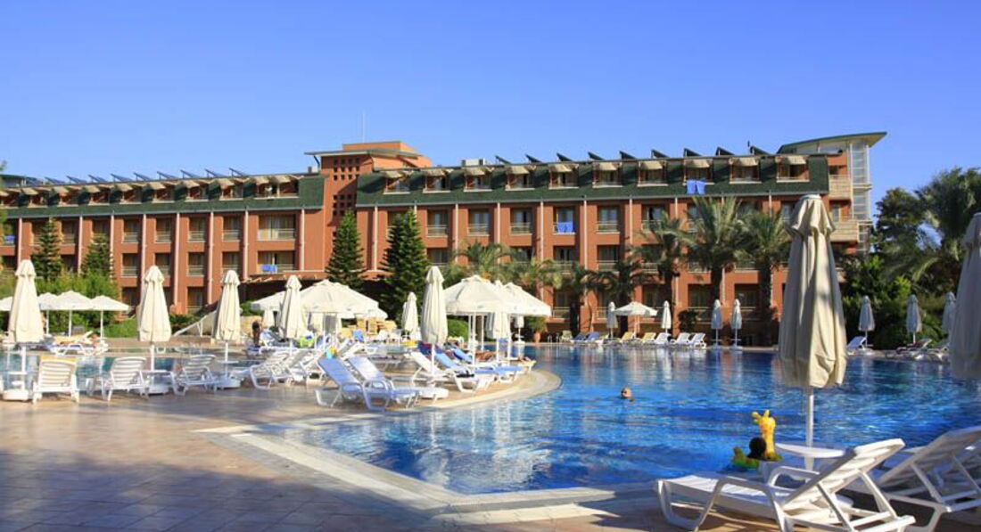 Отдыхали в данном отеле с 4 мая по 11 мая. Состав: двое мальчишек 9 и 11 лет, дочка 3 месяца и соответственно я с женой. Изначально купили путёвку в Клаб, но данный отель ещё не принимал гостей так как народу ещё не так много как в сезон, нас поселили в рояль. Номер у нас был семейный, две комнаты, детская кроватка, балкон, второй этаж, единственное из минусов - балкон выходил на дорогу. Отель нам конечно понравился, всё для тихого семейного отдыха. Брали в аренду коляску для маленькой, 15 евро неделя. Большая ухоженная зелёная территория, гуляли все дни с коляской вдоль моря. Питание отличное, вода питьевая бесплатно в любом количестве. Ходили на базар в авсалар, это где то километр от отеля на право по дороге, большой хороший базар. Отдых очень понравился, на территории есть всё, много водных горок, бесплатное мороженое, отличный сервис. Советую как отдых с детками. Минус если его можно так назвать для нас, не было футбольного поля, играли прямо на газонах, не зря же мяч с собой привезли. Всем удачи, советую этот отель.