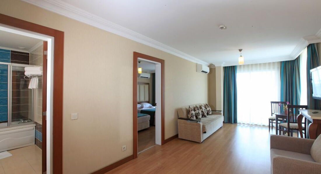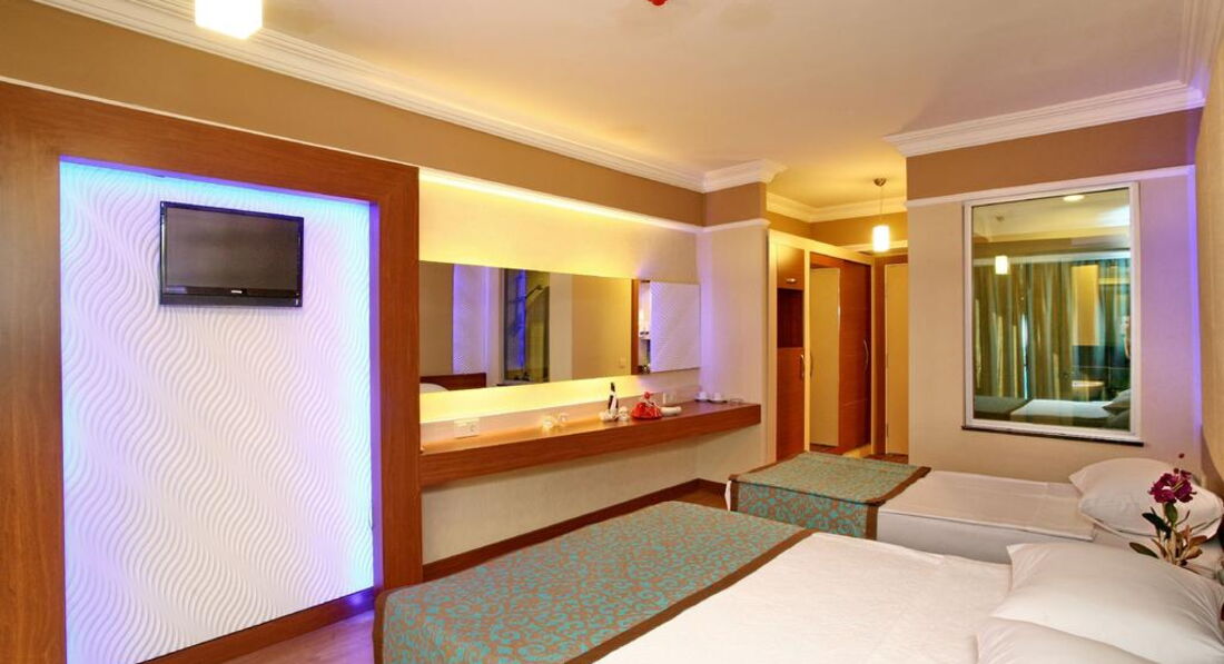 Отдыхали с семьёй, номер был двухкомнатный семейный. На 4-м этаже, с видом на бассейн. Номера оснащены всем необходимым: кондиционер, фен, чайные принадлежности, сейф, просторная душевая комната. В отеле работает русско-говорящий представитель, который любезно проконсультировал нас по прилёту, рассказал где и что находится. На территории отеля большой бассейн, шезлонги и зонтики. Пляж песочный в 5-ти минутах ходьбы от отеля (пляж Клеопатры). Отдельное внимание хочется заострить на превосходной кухне с разнообразным ассортиментом блюд на любые вкусы, и, конечно, на сладости.