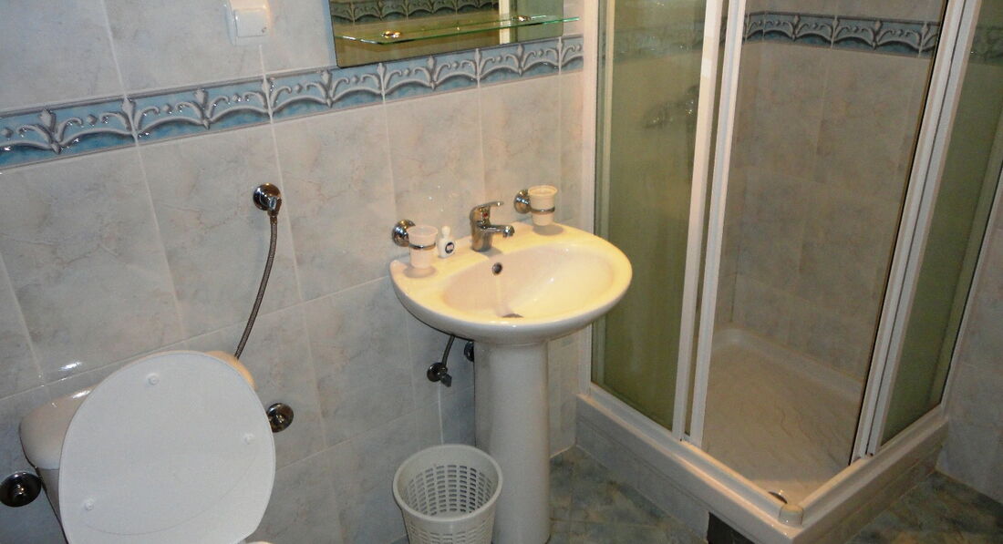 Номер 04: площа 25 м2, тераса 5 м2, 2 французькі ліжка, кондиціонер, ТБ, холодильник, душ.