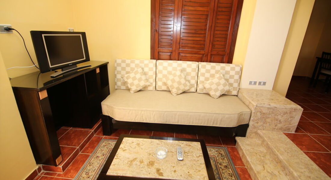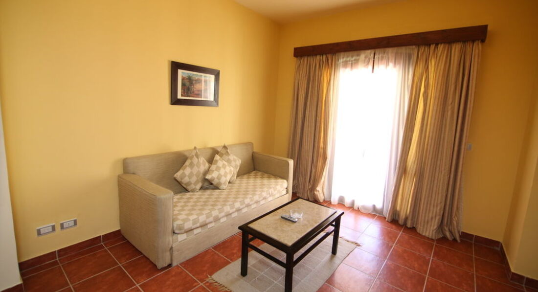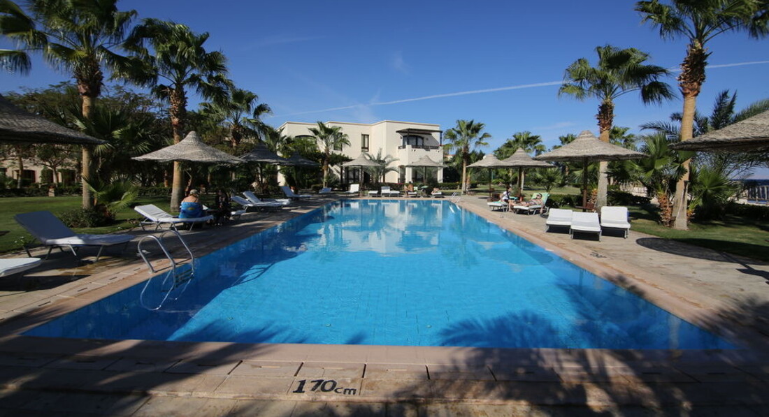 Отдыхали с любимой девушкой на НГ. От аэропорта 15 мин. По приезде неприятно был удивлен, что “Все включено+спиртные напитки” только в одном баре недалеко от ресепшен, в так называемой “Русской зоне”. Бар так и назывался ”Русский бар”. Ни разу не сталкивался с таким оригинальным “Все включено”. Погода была плохая, но эти претензии в небесную канцелярию. Все время дует пронизывающий ветер, видимо, так расположен отель. В связи с этим рекомендую на пляже стараться расположиться за плетенкой, тогда гуд. Правда, чтобы захватить плетенку, нужно вставать рано))) Море штормило, кроме одного дня. Когда штормит, в море не войдешь, т.к. риф. Но риф красивый и куча разнообразных морских обитателей - красотища! Есть понтон, но какой-то тупой, лесенка уходит все равно в кораллы и вся в железках и заклепках. Рекомендую, если получится, заходите в море напротив камней справа и тогда течение Вас понесет неспешно в сторону понтона без всяких усилий с Вашей стороны. Еда в ресторане разнообразная и вкусная с упором в Италию, так как туристы в основном итальянцы. Анимация соответственно тож итальянская. Есть русская девочка Оля-аниматорша, но никакая, поэтому считайте, что анимации русской нет, но она и не нужна, если едешь в теплой компании. Номера убирают ежедневно, но, млин, арабчонок приходит в самый неподходящий момент, а выходить из номера ну совершенно ломает)) можно с ним договориться на попозже. Еще прикол, наш уборщик почему-то не брал оставленный нами бакшиш, хз почему, даже когда я ему лично сказал, мол, можешь, дружище, взять бакшиш со стола, он кивает ОК и не взял, непооонняятно! Ну да ладно, его арабское дело. Брали экскурсию “Рыбалка” за 50 бачей с носа, рассчитана с 8 утра до 6 вечера. Везли на яхте в море 2 часа, 15 мин. ныряние, потом 30 мин. рыбалки на допотопную снасть (пластиковая бутылка с намотанной леской в мизинец толщиной и с якорем на конце, типа спининг)), наживка- кусок кальмара), мы так ниче и не поймали, хотя более удачливые умудрились выловить по нескольку заморских рыбин. Перед экскурсией обещали рыбу пожарить, но не верьте!!, да, пожарили, только для себя экипаж яхты)) Происходило енто действие типа в заповеднике, но ничего особенного, ныряние в отеле более захватывающее. В отеле также присутствует русскоговорящая сотрудница Анна, но можете к ней не обращаться, т.к. на все вопросы и пожелания у нее один ответ “Таковы правила отеля” и… милая улыбочка. Еще предостережение! Следите на пляже за полотенцами! Уводят, а потом требуют штраф 13 бачей. При этом эта же Анна грит, мол, у Вас есть сейф в номере.. загадка, а не женщина, как это она себе представляет???)) Теперь о номерах, это круто, я это серьезно!!! Сами увидите, если посетите отель, хотя, некоторым ребяткам достались номера похуже, чем у нас. Бар ( Русский бар), тоже прикол, пиво (напиток пенистый, если кто забыл) разливают в 150 грамовые пластиковые стаканчики, так что на выходе получается пива грамм 50))) клево для любителей этого напитка, замучаешься ходить. Правда был такой бармен Магди, хороший чел, если с ним по-человечески и с улыбкой, то он может и налить в “хрустальную” кружку. Напитки таковы: виски, ром, пиво, вино бело и красна(все местного производства, поэтому пьешь не для удовольствия, а чтобы забалдеть). Закусь тока ближе к вечеру: сандвичи с сыром. Исчо наблюдали такую прекрасную картину в ба