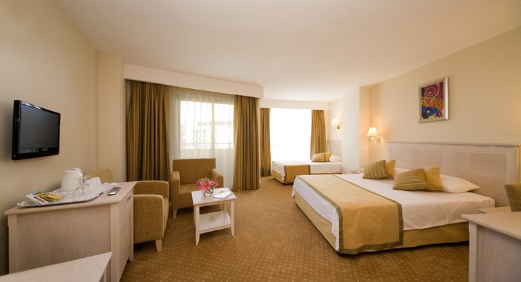 Отдыхала с мужем с 23 августа по 1 сентября. Этот отель не для молодёжи, больше всего подходит для семейного отдыха (с маленькими детьми), молодёжи там будет скучно. Территория маленькая, ужасная, кроме маленького бассейна, из-за воды которого у некоторых детей была непонятная сыпь по телу (пишу то, что сама в действительности видела). Анимация только для детей, даже анимацией это назвать сложно, взрослым там делать нечего. Пляж не оборудован. В море одни камни, валуны, рифы. Пораниться очень легко, чем практически все и занимались, потому что стоит только со стороны посмотреть на человека, который входит в море, скривившись от боли. На соседних пляжах такая же обстановка. По поводу еды: сначала вам покажется, что шведский стол очень разнообразен, но дней через 5 вы уже поймёте, что есть нечего, однообразие пищи утомляет. Русские салатики с помидорами, огурцами, луком, зеленью заканчивались в считанные секунды, подобные русские блюда так же сметались на "ура", турецкие нет. Русских блюд, сами понимаете, мало, поэтому для приверед в еде лучше не ездить в этот отель, я например похудела на 2 кг (при весе 48 кг). Если будете брать в аренду сейф, ни за что не сдавайте ключ от него на ресепшн, как это сделала одна семья. На территории отеля есть Турецкая баня, при входе в неё надо всё ценное сдавать в камеру хранения. Женщина сдала ключ от сейфа. После посещения бани из сейфа пропали все деньги. Туристы были только второй день! С маленьким ребенком. Ни экскурсий, ни какких других развлечений они уже не могли себе позволить. Не пойман, не вор, делайте выводы сами, кто ворует! Сразу предупреждаю: сотрудники анимации, сотрудники с ресепшена и прочие турки из отеля будут во время ужина подсаживаться к вам, болтать, шутить и т.д., втираться в доверие, вот потом не жалуйтесь, что у вас что-то пропадает. Если будет возможность, просите в день приезда на ресепшене (за доллары разумеется) номер угловой, у нас был № 1416, угловые номера в 2 раза больше, просторнее, хоромы проще говоря!!! По поводу напитков: разбавляют водой абсолютно всё! Чтобы от их пива "захмелеть", придётся выпить наверное 1,5 литра, колу, спрайт и прочие напитки тоже разбавляют. Фруктов вообще не было, кроме розовых и кислых арбузов. Приходилось ругаться с турками в прямом смысле слова! С нами в компании была девушка, которая знала турецкий, благодаря ей на ужин как-то выдали персики! Под конец отпуска в отеле очень много было туристов-турков, и только из-за них стали появляться фрукты: персики, виноград....Своих они уважают! Не смотря на все минусы, уезжать не хотелось, ну как после такого солнца и жаркой погоды ехать в дождливую и холодную Москву? Будут вопросы - задавайте, лучше узнать информацию из первых рук, чем выученную на несколько лет вперед в тур. фирме.
