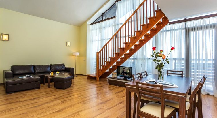 One Bedroom Apartment Main Building (спальня з двома односпальними ліжками, суміжні двері, вітальня з розкладним диваном, кухонним куточком (холодильник, посуд, електрочайник, пральна машина, плита та духовка) та обіднім столом, балкон, ванна кімната з душем або з ванною, максимум 2+2 або 3 особи, 65 м2);
