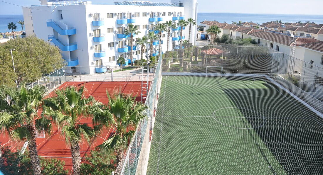 На территории отеля есть теннисный корт, футбольная площадка, сауна, бассейн и бар, небольшая детская площадка. Также есть лужайка с лежаками перед собственно пляжем. Отель настолько близко к морю, что искупавшись можно идти к своему лежаку на лужайке и тратиться на аренду зонтика на самом пляже. Бухта, к которой прилегает отель, небольшая (как и все на побережье), но людей не очень много, вход в море очень приятный: песочек и небольшая глубина.