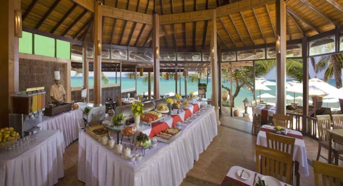 Ресторанчик на территории отеля очень милый. Завтраки хорошие, разнообразия нет, но на 8 дней я скомбинировала разные продукты и получила прекрасные разнообразные варианты. Днем и вечером мы там не питались, но в последний день вышли поужинать, замечательная атмосфера, хорошее обслуживание, столики выносят на пляж, что довольно романтично, несколько раз в неделю поет живым голосом приятный дяденька. Вам понравится.