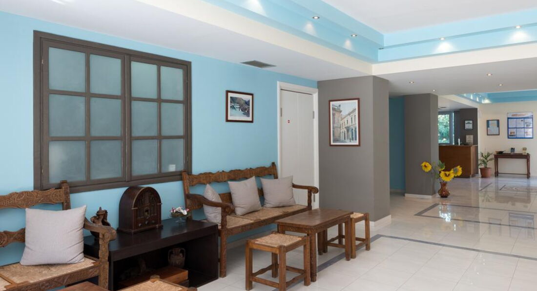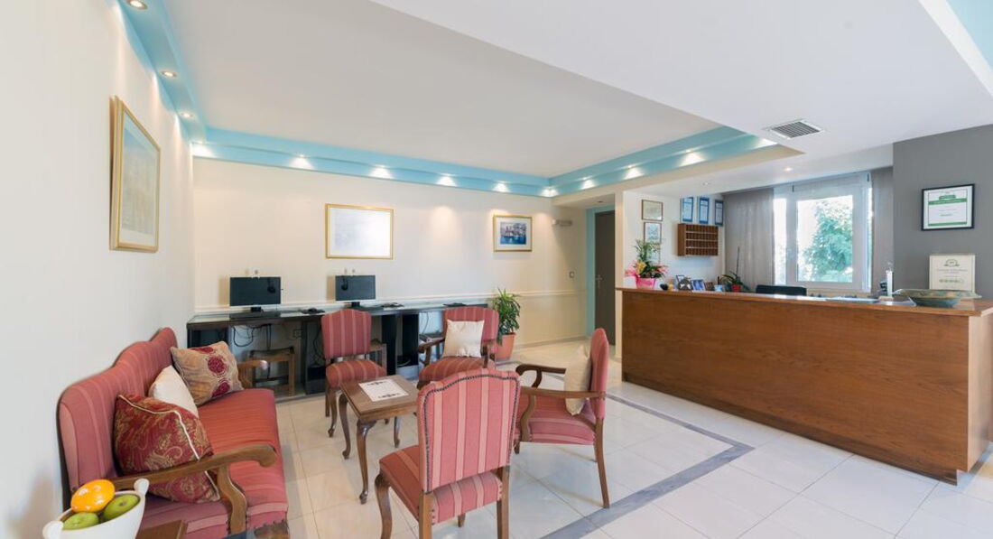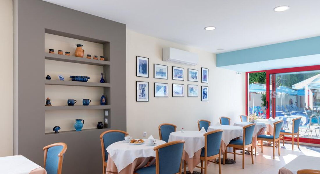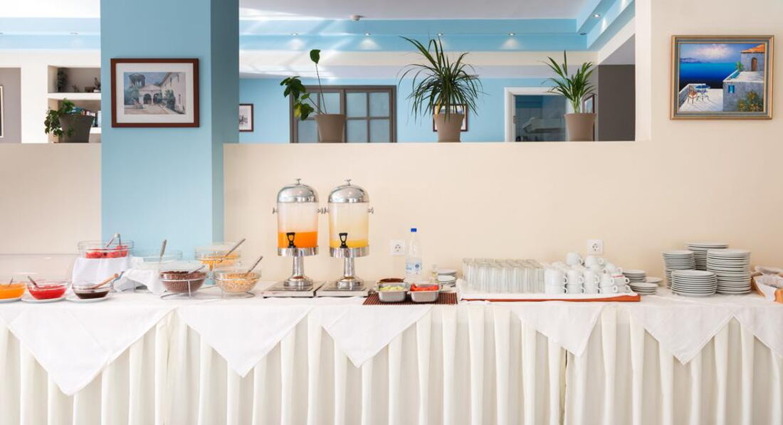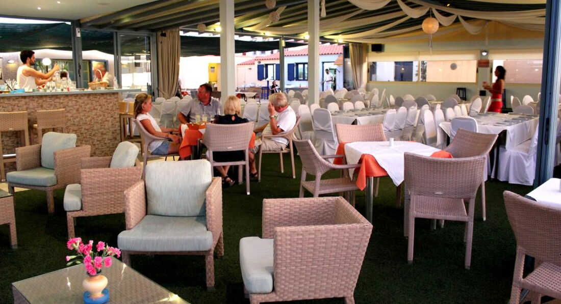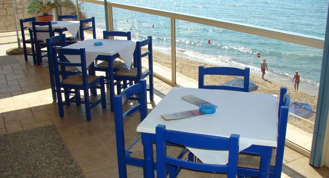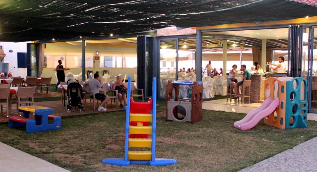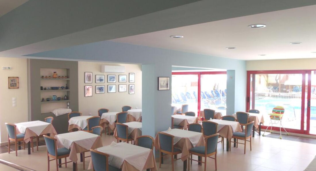 Територія та послуги: • основний ресторан (грецька кухня, "шведський стіл", макс. 500 чол.) • снек-бар біля басейну (08:00-00:00) • бар на пляжі (08:00-00:00) • wi-fi на території • автопарковка • велопарковка • камера зберігання Розваги та спорт: • 2 відкриті басейни (55, 20 м2) • читальна зала • лаунж-зона з ТБ • інтернет-кафе (3 євро на годину) Для дітей: • відкритий басейн • анімація (Magic show) • ігровий майданчик • меню в ресторані (за запитом) • дитяче ліжечко (за запитом, безкоштовно) • дитячі стільці в ресторані (за запитом) Живлення: • HB – сніданок та вечеря. • AI – «увімкнено».Концепція AI діє з 10:00 до 22:00 і включає:
