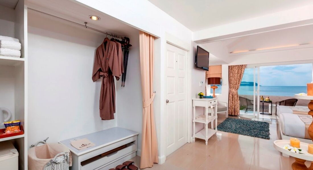НОМЕР. Мы остановились в номере Thai villa ocean view, который располагается на третьем ярусе холма. Добираться до номера можно было на фуникулере, либо пешком (в светлое время суток). Прогулки на фуникулере, конечно, несколько удлиняют путь до номера, зато придают некую изюминку отдыху. С террасы открывался вид на море, которым мы любили наслаждаться по вечерам лёжа в шезлонгах с бутылочкой местного напитка. Правда, из номеров, расположенных повыше (4-6 ярусы), полагаю, вид был бы более впечатляющим, но и добираться до них уже подольше. Номер для двоих человек довольно просторный с большим санузлом и джакузи на балконе. Правда, вода в джакузи течет еле-еле, так что пользоваться им было затруднительно. В номере: большая двуспальная кровать, встроенный гардероб, комод с сейфом и мини-баром, туалетный столик, диванчик для отдыха, два лежака на просторной террасе, ЖК-телевизор, тумбочки с лампами, чайник и чашки. Ремонт хороший, мебель не самая новая, но не вызывала отторжения или брезгливости. Централизованная система кондиционирования работала без нареканий, а вот с горячей водой были перебои, но нас особо не стеснило. Шумоизоляции в номерах нет: хорошо слышно телевизор соседей и их разговоры. Для меня это – ад!