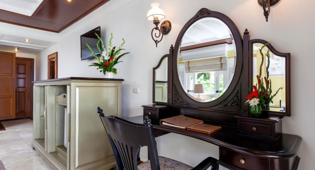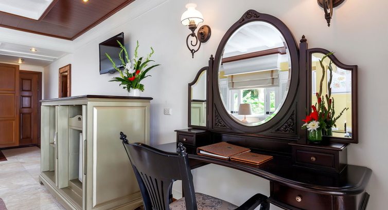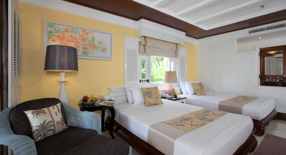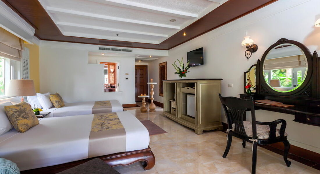 При заселении выяснилось, что все такие домики заняты. Заселили в номер категории «Вид на тропический бассейн» - это номера на 2-м этаже в коттеджах на четыре номера. Такой номер дороже и более высокой категории. Вид на очень красивый бассейн, утопающий в тропической зелени. Мебель деревянная, старая, сантехника тоже старая, кровати удобные, просторный балкон со столом и двумя лежаками, сушилкой для полотенец. В номере халаты/тапочки, пляжные полотенца, полотенца для душа. Душевые принадлежности - на них отель сильно экономит. 1 малюсенький кусочек мыла, 1 бутылочка геля для душа, 1 бутылочка шампунь+кондиционер, 1 бутылочка бальзама для тела. Бутылочки не одноразовые, туда при уборке номера каждый раз доливают содержимое. Каждый номер оборудован кондиционером. Часть кондиционера, которая снаружи на улице очень шумит, что создает практически непрерывное звуковое сопровождение в номере. Кстати при уборке персонал не крутит фигурки из полотенец. Оставляли чаевые ради интереса, все равно ничего – ни цветочка ни фигурки. Номера не соответствуют 5* и цене.
