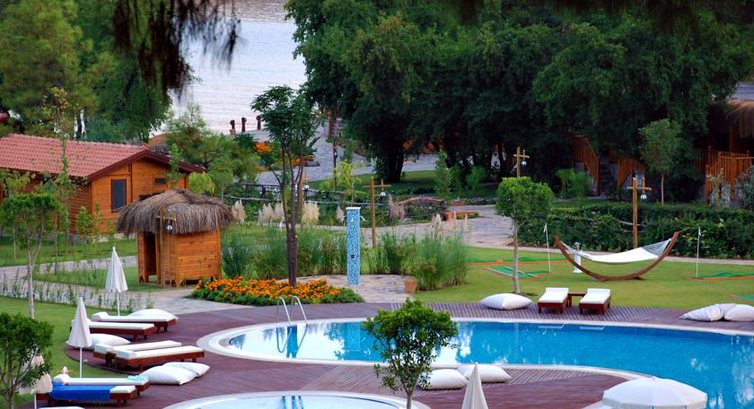 Отдыхали в этом отеле с 25.05 по 04.06.2010. Полностью солидарны с предыдущим отзывом, кроме оценки отеля. Прекрасное расположение отеля, ухоженная территория, птички, белки, куры с утками-все красиво. Если вы оплатили номер категории А,В,С -вы однозначно попадете в А. Номера этой категории находятся в двухэтажных деревянных корпусах по 5 комнат на этаже. Звукоизоляции никакой, мебель убогая, обшарпаная дверь в ванную комнату норовит вывалиться из косяка(А3). Если у вас есть свободые деньги(100$ не хватит) вы можете переселиться в номер более высокой категории(Д, Е и тд). Что мы и сделали. Поселили нас в шикарный двухкомнатный домик. Гостинная, спальня, плазма и там, и там, большая ванная комната с джакузи и одним разболтанным крючком. Второй халат можно повесить и на дверь, не баре. Убогий платяной шкаф с прогнутой полкой напоминает о мировом финансовом кризисе. Чемодан на полу, ну или под кровать. Места для него не предусмотренно." Ресторан " Вера подробно описала. Добавлю лишь очень вкусный и красивый по исполнению лаваш, испеченный при вас в печи. Ресторан ла карта не работает. Бар у басейна не работает(во всяком случае при нас). У басейна на 10 лежаков 2 зонта. На пляже на 30 зонтов-2 урны(опять проклятый кризис).На некоторых сайтах отель подается как "отель для взрослых", 16+. Это неправда. Дети в отеле есть и довольно много, в основном турки. Большое преимущество отеля в том, что народу немного, никто никому не мешает, нигде никакой толчеи. И еще - воздух, вкусный(если это слово здесь уместно), чистый. Вывод: хороший отель, но цена слишком завышена. Для Веры: русскоязычную девушку Оксану хозяин уволил.