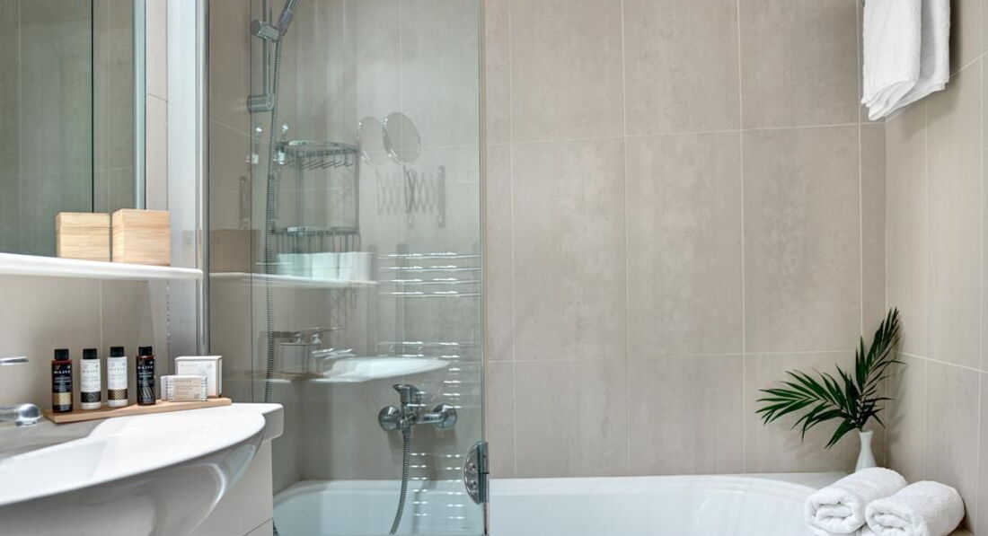 • ванна кімната з ванною, душем та феном