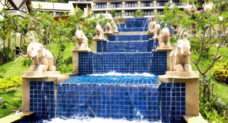 Расположен он на возвышении, каскадом, территория большая и очень красивая: клумбы, фонтанчики с лотосами, традиционные скульптуры слонов больших и маленьких, несколько прекрасных бассейнов, все это очень ухоженно и буквально утопает в цвету тропических растений, очень спокойно и умиротворенно, атмосфера релакса и романтики - все спланировано для полноценного отдыха как души, так и тела. По всей территории ездят шатлы для тех, кому неохота ходить пешком - очень удобно, т.к. они всегда ждут на ресепшене своих постояльцев, чтобы отвезти к нужному корпусу. Вечером на стенах и заборах можно наблюдать саламандров, которые охотятся на мотыльков, а днем летает очень много птиц. Еще коты без хвостов разгуливают (тайцы верят, что на кончике хвоста живут злые духи и еще котенку отрезают его)