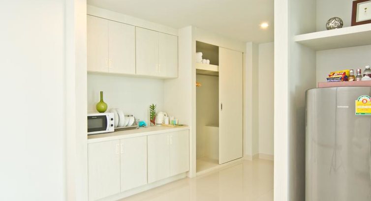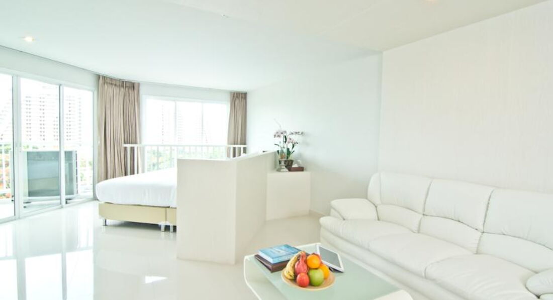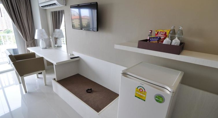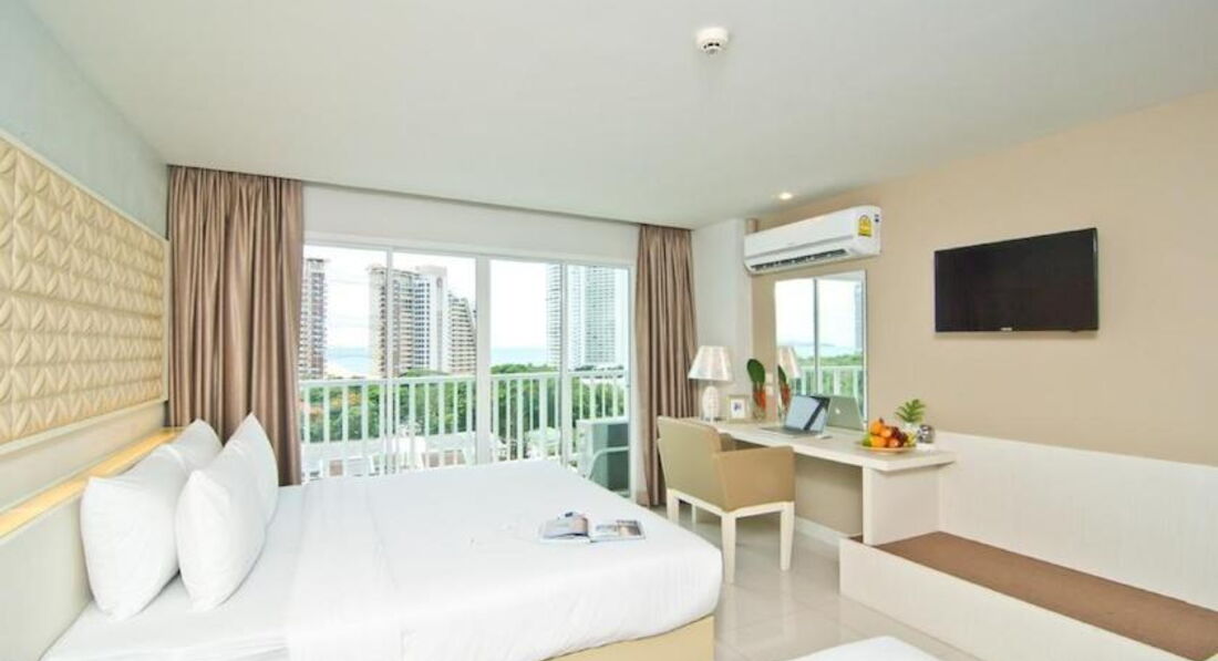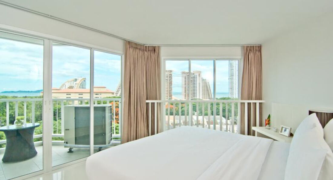 Окна и балконы всех комнат смотрят в сторону моря, правда само море и Ко Лан видны только с верхних этажей, остальным вид закрывает 5-звёздочный Центара Гранд Мираж, расположенный в первой линии.