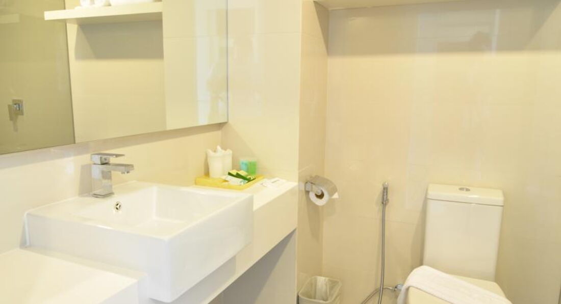 В стандарте была одна кровать кингсайз,вид на Центару.Балкон с сушилкой,но без столика со стульчиками,может ещё не закупили .Номер достаточно большой,около 29 м,больщой с-у с душевой кабиной и душевой лейкойв потолке-эффект дождя,не совсем удобно,хотя лейка регулируется,но не снимается.Туалет со шлангом для гигиены.Мыло-шампунь пополняют ежедневно,хорошего качества.Зубных щёток и станков для бритья нет.