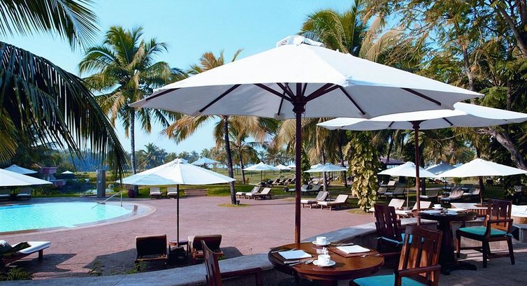 Cavelossim. Расположен на мысу. Один из самых престижных отелей Гоа. Красивая, утопающая в зелени территория. Отличные номера. Можно почувствовать индийский колорит, в сочетании с безупречным сервисом. Лёгкая анимация по вечерам. Для детей есть мини клуб. Немного переоценён. Развитая инфраструктура. Находится непосредственно в посёлке, есть куда выйти( до магазинов 5-7 мин), но на пляже местных нет. Подойдёт для взыскательных клиентов.